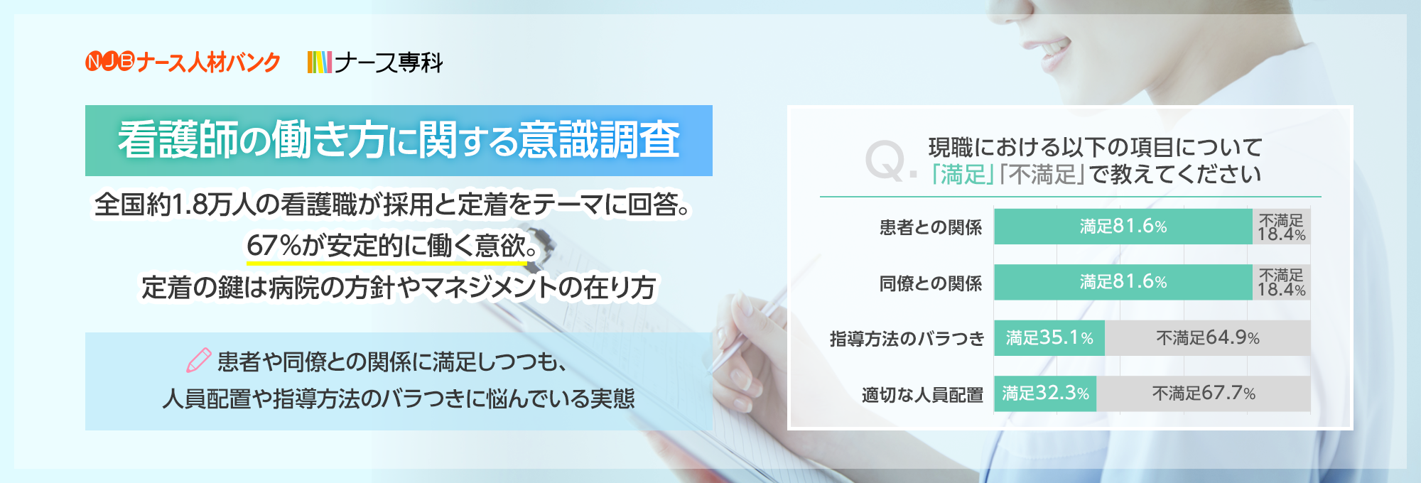 【看護師の働き方に関する意識調査】全国約1.8万人の看護職が採用と定着をテーマに回答。67%が安定的に働く意欲。定着の鍵は病院の方針やマネジメントの在り方