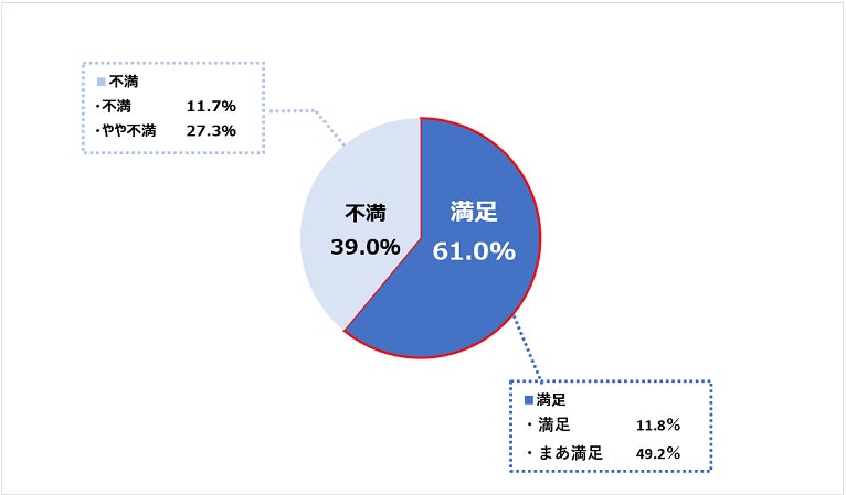 「満足」が11.8%、「まあ満足」が49.2%、「やや不満」が27.3%、「不満」が11.7%。半数以上が満足している。