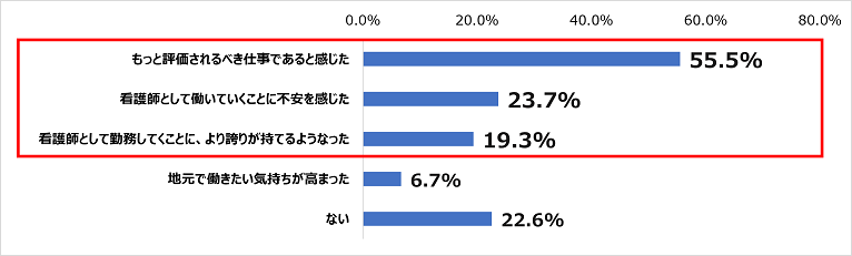 「もっと評価されるべき仕事であると感じた」が55.5%、「看護師として働いていくことに不安を感じた」が23.7%、「看護師として勤務してくことに、より誇りが持てるようなった」が19.3%。ネガティブな意見は多いものの、コロナ禍でより誇りを持てるようになった層もいることがわかった。