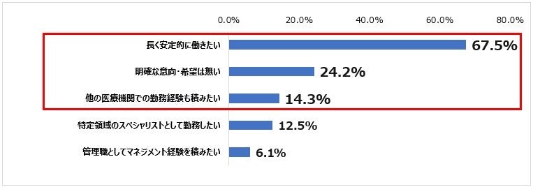 「長く安定的に働きたい」が67.5%、「明確な意向・希望は無い」が24.2%、「他の医療機関での勤務経験も積みたい」が14.3%。
