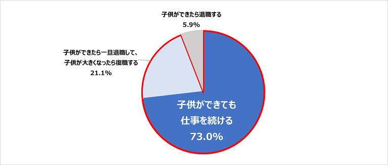 「子供ができても仕事を続ける」が73.0%、「子供ができたら一旦退職して、子供が大きくなったら復職する」が21.1%、「子供ができたら退職する」が5.9%。働き続けたいという意思を感じる内容となった。
