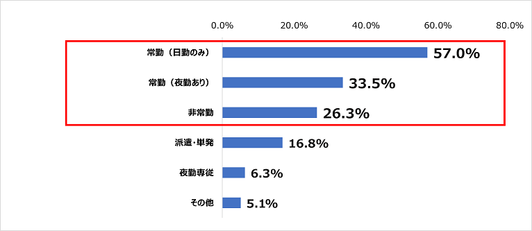 転職後の働き方の希望は「常勤(日勤のみ)」が57.0%、「常勤(夜勤あり)」が33.5%、「非常勤」が26.3%。3人に1人は夜勤ありを求める結果ではあるが、日勤のみを求める声は大きい。