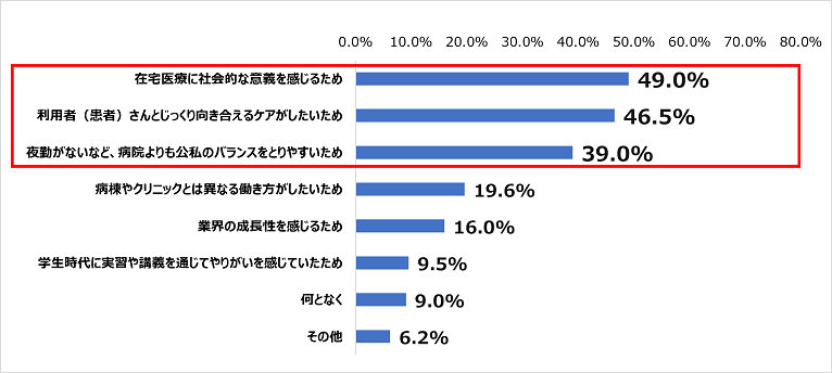 「在宅医療に社会的な意義を感じるため」が49.0%、「利用者(患者)さんとじっくり向き合えるケアがしたいため」が46.5%、「夜勤がないなど、病院よりも公私のバランスをとりやすいため」が39.0%。在宅医療に社会的意義を感じ、患者に向き合うケア、夜勤のない働き方などに興味関心を抱いていることがうかがえる。