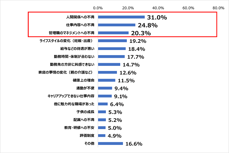 「人間関係への不満」が31.0%、「仕事内容への不満」が24.8%、「管理職のマネジメントへの不満」が20.3%。退職の理由に関しては、職場選びの重要ポイントではなかった点が不満の要素となっている。