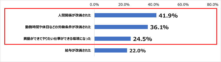 退職を取りやめるに至った退職理由の改善内容については「人間関係が改善された」が41.9%、「勤務時間や休日などの労働条件が改善された」が36.1%、「異動ができてやりたい仕事ができる環境になった」が24.5%だった。人間関係の改善は退職抑制の大きなポイントになると考えられる。
