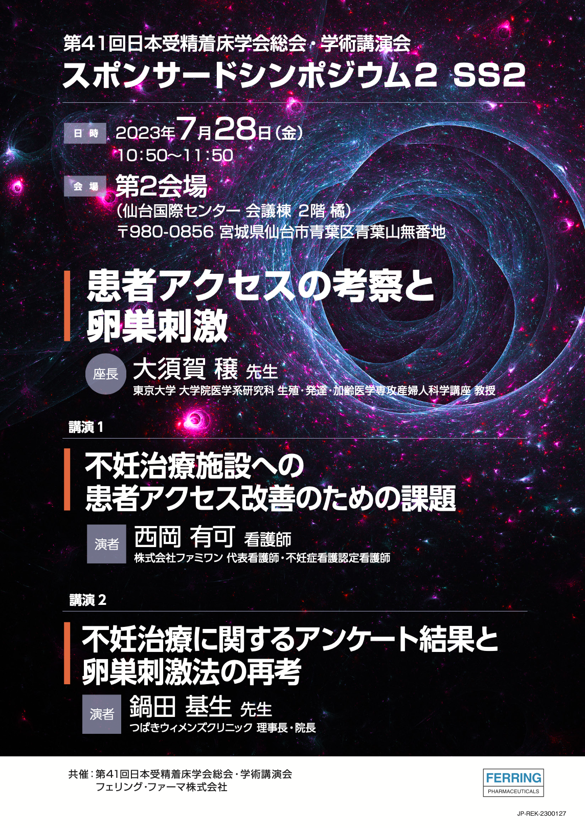 日本受精着床学会総会・学術講演会は2023年7月27日(木曜日)・28日(金曜日)、仙台国際センターにて実施されます。講演会は「ART2023 変わらぬ路と新たなる歩み―保険診療のステージへ―」と題し、会長は医療法人翔仁会 仙台ARTクリニック理事長の吉田 仁秋氏が務めます。西岡は7月28日(金)10:50~11:50スポンサードシンポジウム2にて「患者アクセスの考察と卵巣刺激」のプログラムに登壇します。座長は大須賀穣先生、フェリング・ファーマ株式会社が共催となります。