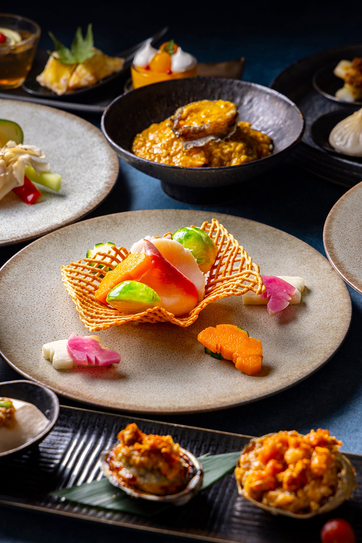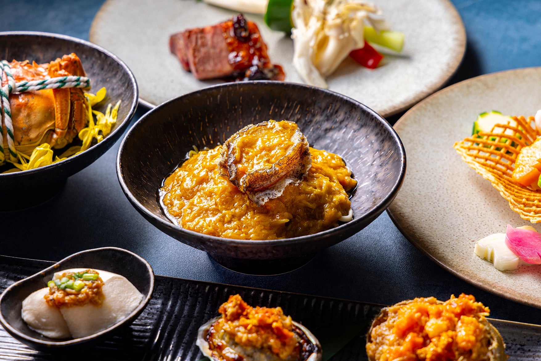 脂肪が滑らかで口どけが良く、柔らかさと風味に優れた信州プレミアム牛もチャイナシャドースタイルでご用意いたします。〆には磯の香りやこりっとした食感が抜群の蝦夷鮑をのせた、風味豊かな上海蟹あんかけのイーフー麺をお愉しみ下さい。旬の贅沢な味わいを余すことなく詰め込んだ、冬の口福ディナーコースをご堪能いただけます。