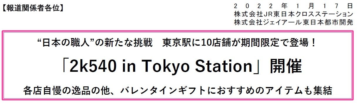株式会社JR東日本クロスステーション、および、株式会社ジェイアール東日本都市開発は、“日本のものづくり”をテーマにJR秋葉原駅・御徒町駅間の鉄道高架下に展開する商業施設「2k540 AKI-OKA ARTISAN(ニーケーゴーヨンマルアキオカアルチザン)」 (以降、 「2k540」)が、2021年9月に全体開業から10周年を迎えたことを契機に、 “日本の職人”による新たな10年への挑戦の第1歩として、 1月24日(月)~2月7日(月)の期間、JR東日本東京駅にて、「2k540 in Tokyo Station」と題した販売イベントを開催します。期間中は、「2k540」からアクセサリーや鞄、家具など、バラエティ豊かな10店舗が期間限定で東京駅のイベントスペースに出店し、職人技を発揮した各店自慢の商品や、バレンタインギフトにおすすめのアイテムを販売することで、“日本のものづくり”の魅力を東京駅から発信します。