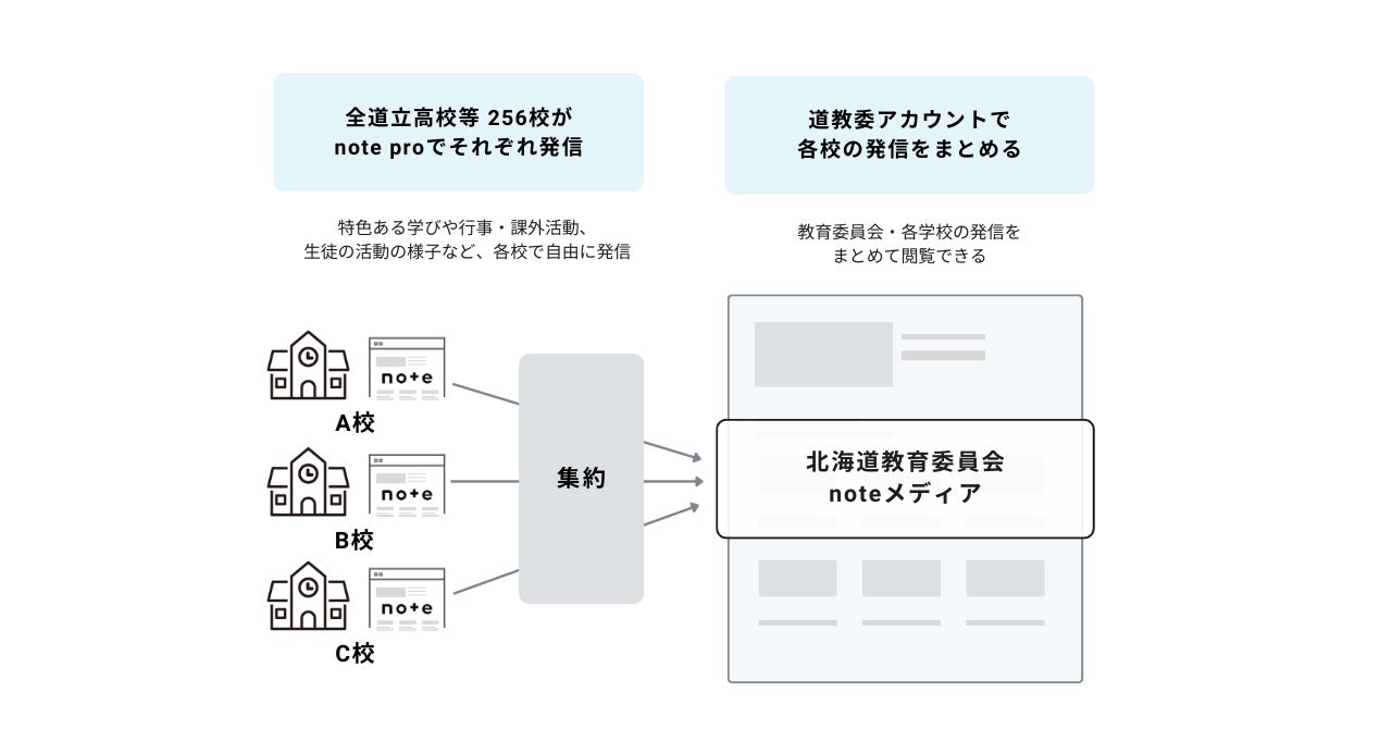 本協定の締結により、北海道の全道立高等学校・中等教育学校・特別支援学校の計256校がnoteのアカウントを開設。道教委が各学校のnoteの記事をまとめるオウンドメディアをnote上に構築します。