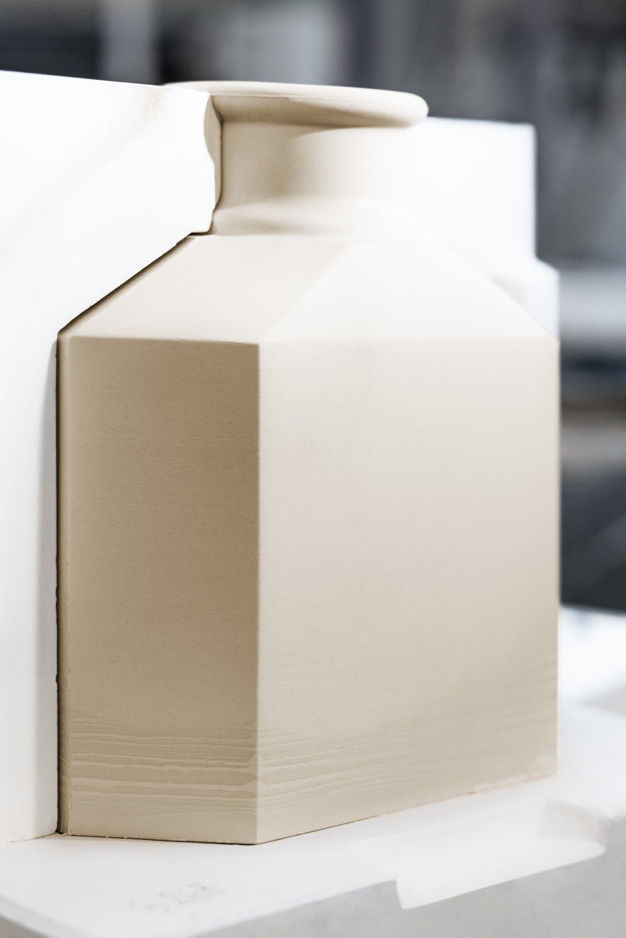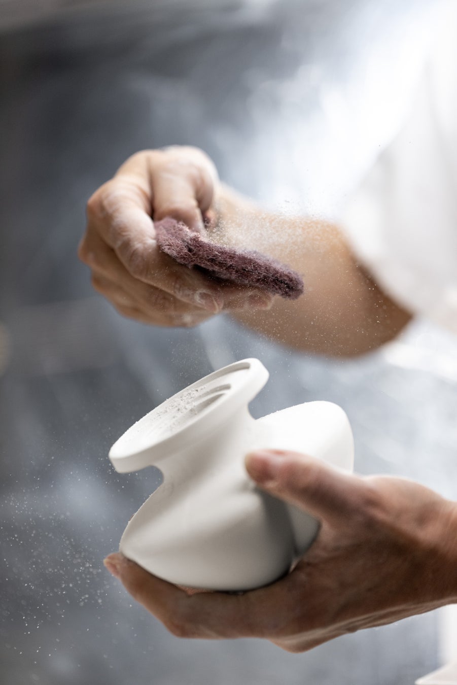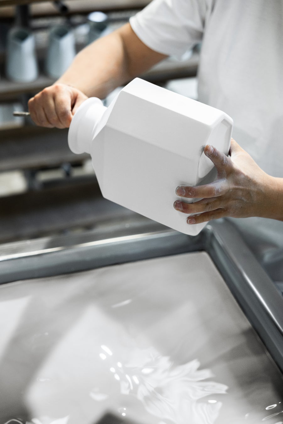 まず最初に、デッサンに基づき、石膏の型を作ることから始まります。そこから作られた鋳型に粘土液を流し込むと、多孔性の石膏が粘土液に含まれる水分を吸収し、型通りの形に固定されます。その後、980℃で一次焼成( 素焼き)を行います。これにより磁器は固まり、水分が抜け多孔質になり、表面にほうろうが吸着しやすい状態になります。その後、焼き物の表面に一定の厚みで釉薬を塗る、非常に高い職人技を要するほうろう引きを施し、最後に1400℃で2 回目の焼成(本焼き)を行います。本焼きにより、表面の粘土とほうろうはガラス化し、白く透明感のある見た目へと変化、磁器を恒久的に硬化させます。