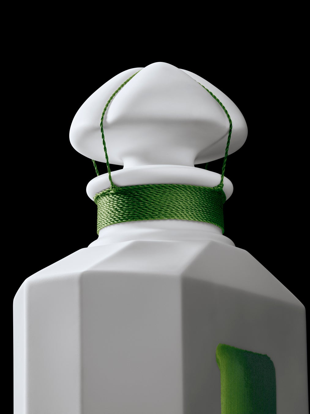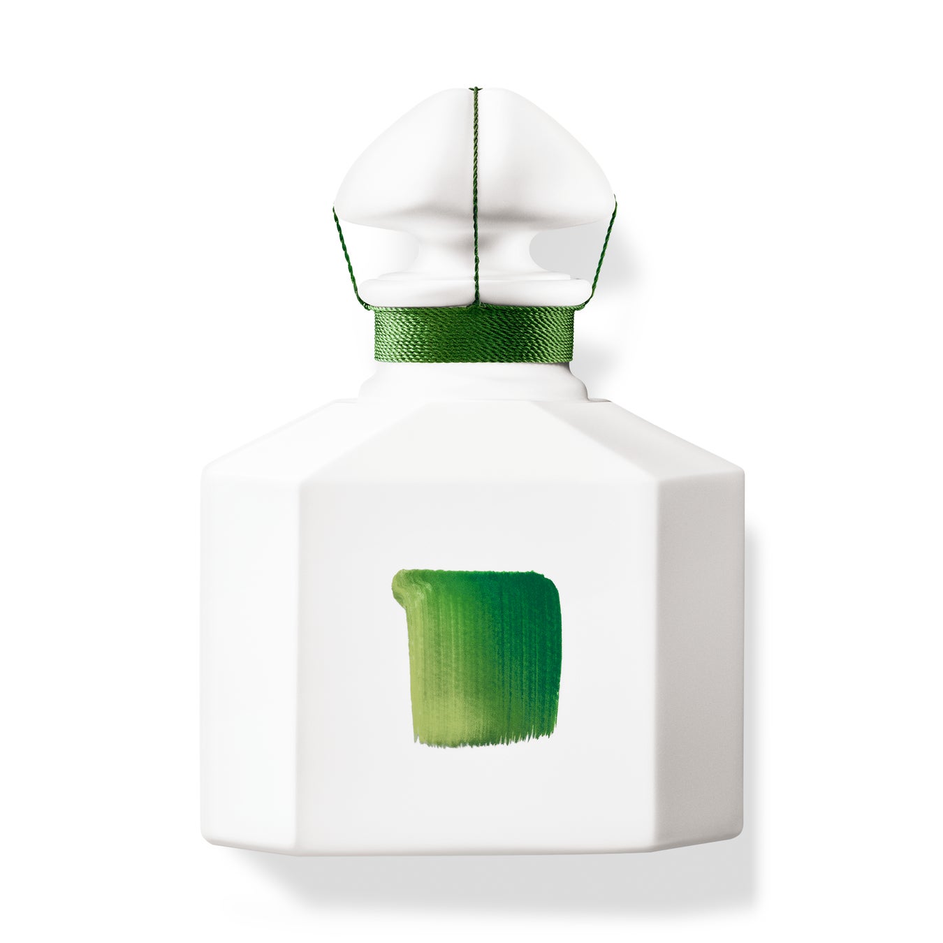 〈エクセプショナルピース 李禹煥〉は、ゲランの伝統的なクアドリローブボトルに李禹煥の代表作の一つ「Dialogue( 対話)」シリーズからエクスクルーシブな鮮やかな緑のバージョンが描かれます。不穏なほどに鮮明に描かれた大胆な緑の筆跡。一見ごくシンプルなブラシストロークは、描かれている部分と描かれていない空白部分の、物質と空虚の、色彩と無垢な磁器の間の対話を示し、その色面からは、動き、エネルギーの躍動が感じられます。グレーの単色で始まったこのシリーズは、その後、青や赤などでも製作されるようになりましたが、今回李が選んだ色は、彼にとっては異例と言えます。