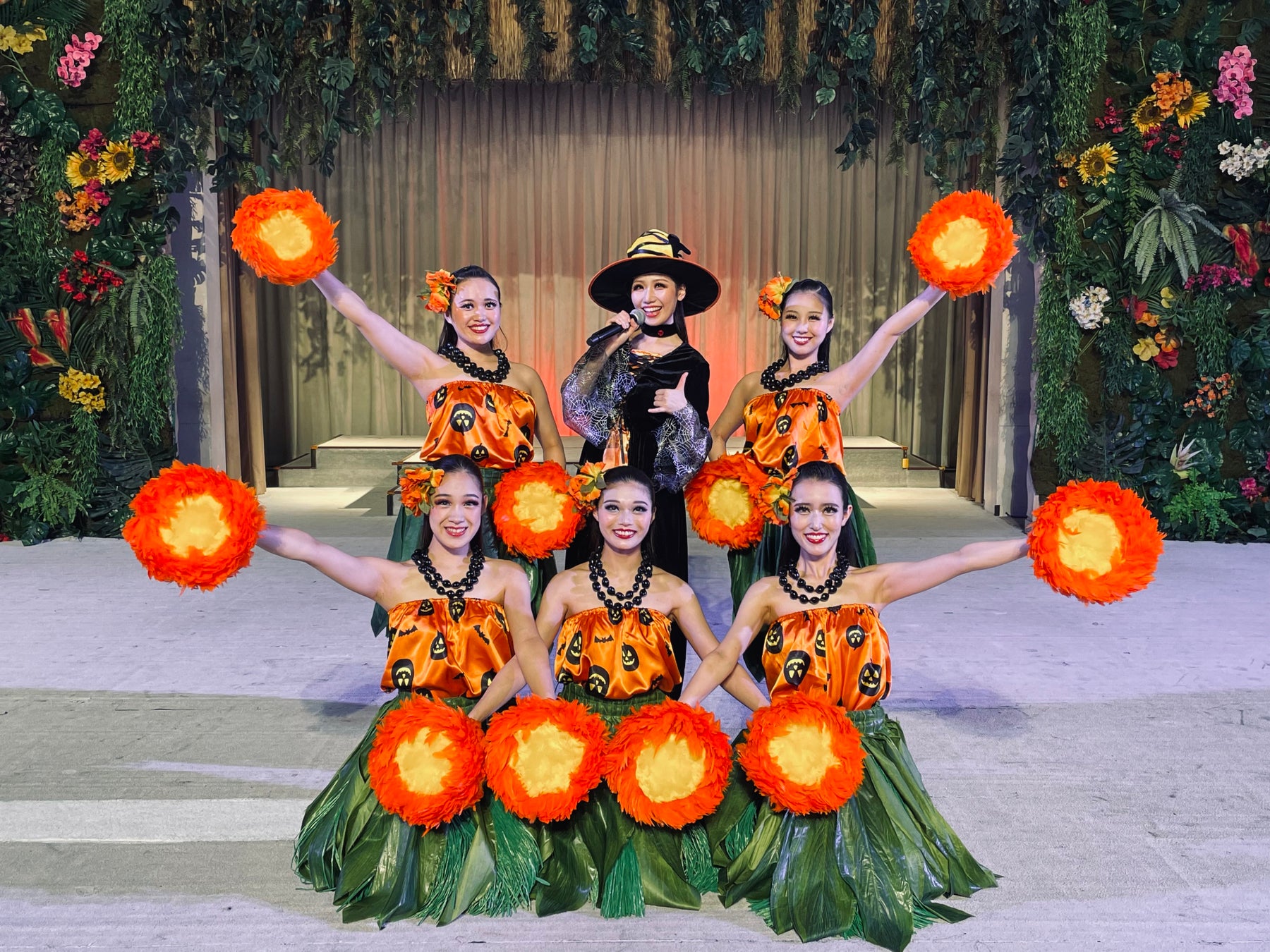 今回のハロウィンバージョンでは、オープニングのフラの演目「ハノハノハワイ」の衣装をハロウィンバージョンでお届けするほか、お客様がステージ上でフラガールと一緒にフラダンスを踊る「フラダンス体験コーナー」の進行役のフラガールが、ハロウィンでお馴染みの魔女の衣装で登場します。