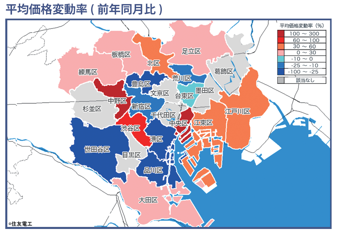 地図の各行政区ごとの色の違いは、同行政区における平均価格の前年同月比(平均価格変動率)の程度を表しています。