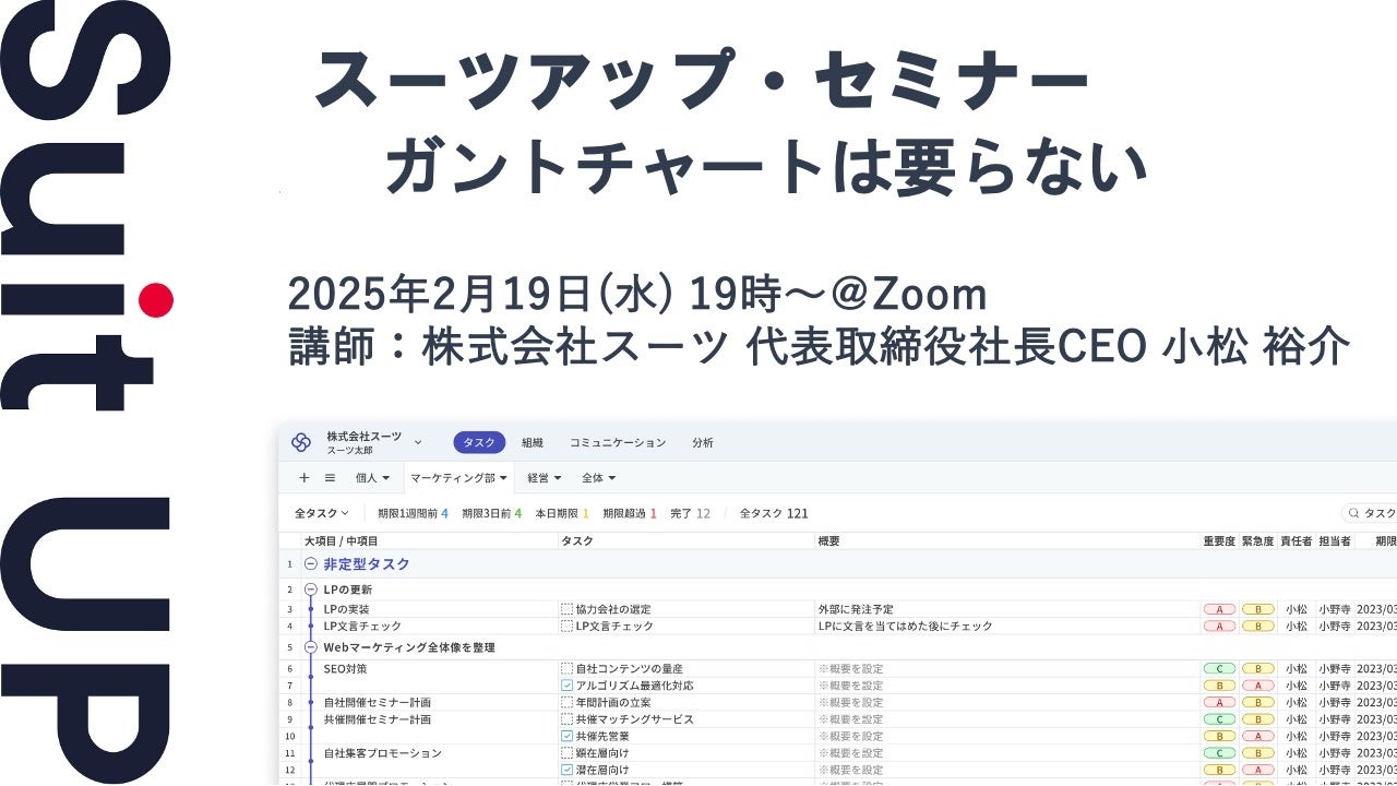 株式会社スーツ(所在地:東京都千代田区、代表取締役社長CEO:小松 裕介)は、2025年2月19日(水)19時から、当社代表の小松が講師を務めるスーツアップ・セミナー「ガントチャートは要らない」を無料開催します。