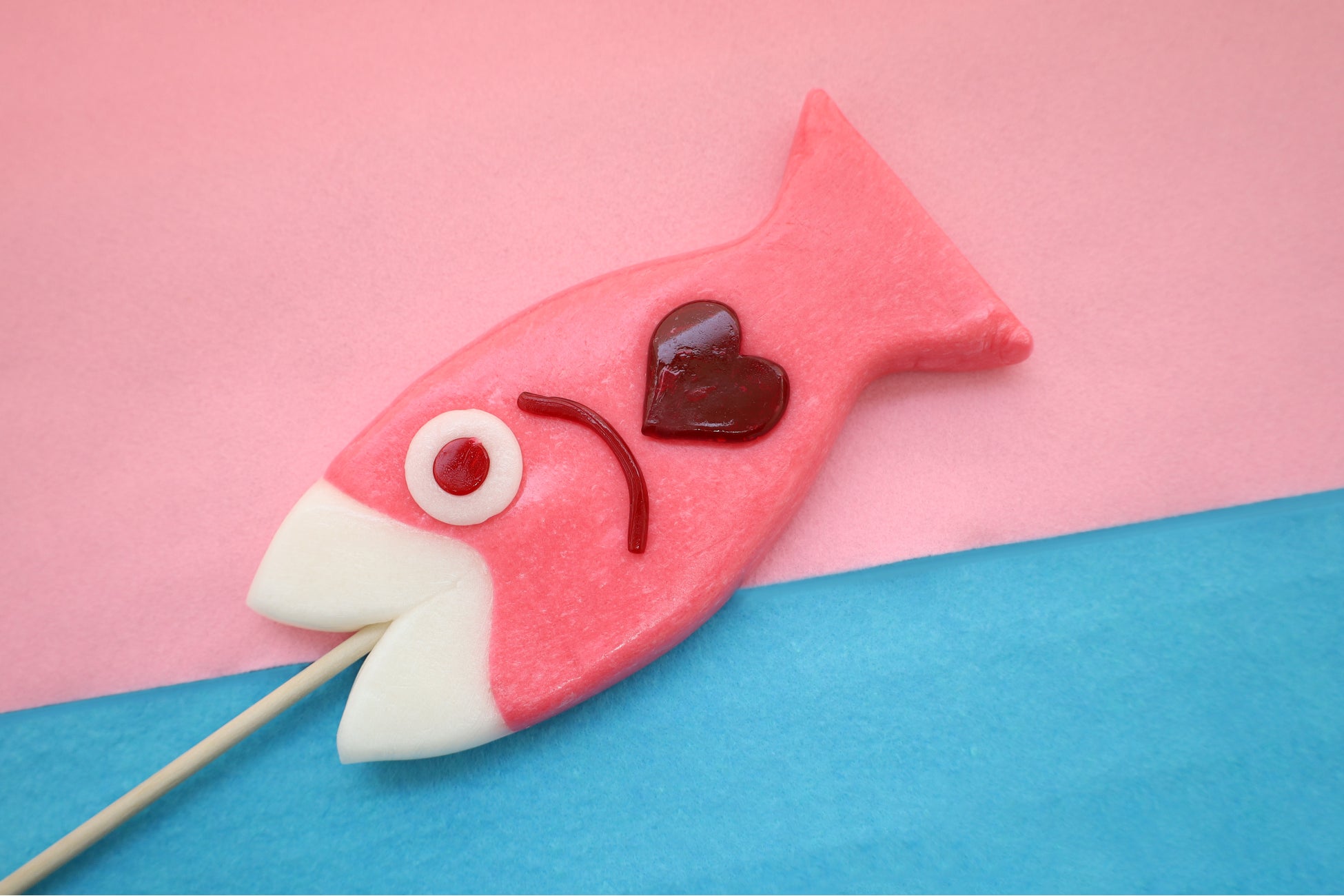 ピンクたっぷりヒレにはハートもついてカワイイキャンディにしました。贈られた男性には、照れ隠しに豪快にかぶりつく食べ方もオススメです。