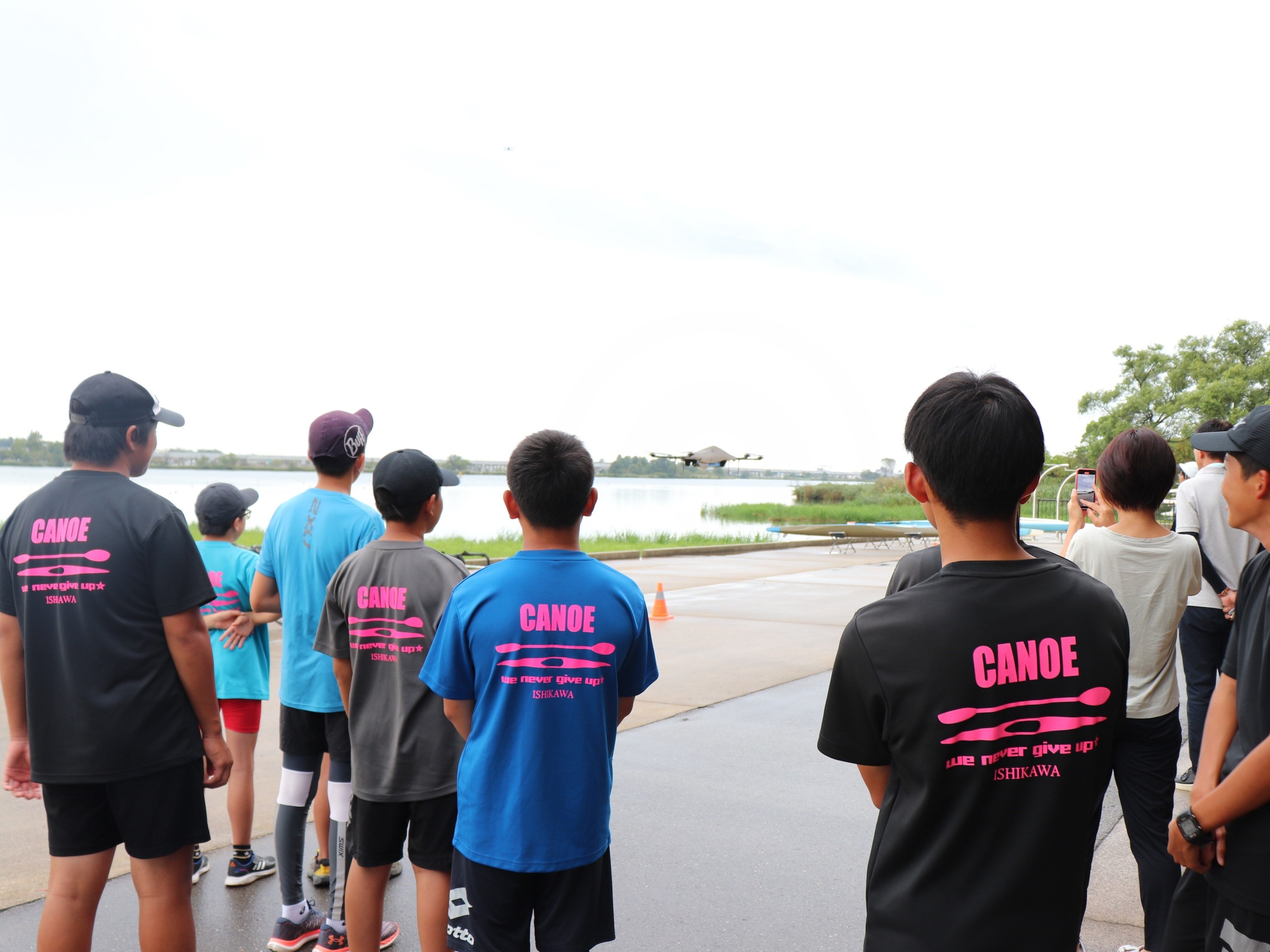 牛丼弁当がドローンで届く様子を見守る小松ジュニアカヌークラブの皆さん(木場潟カヌー競技場艇庫)