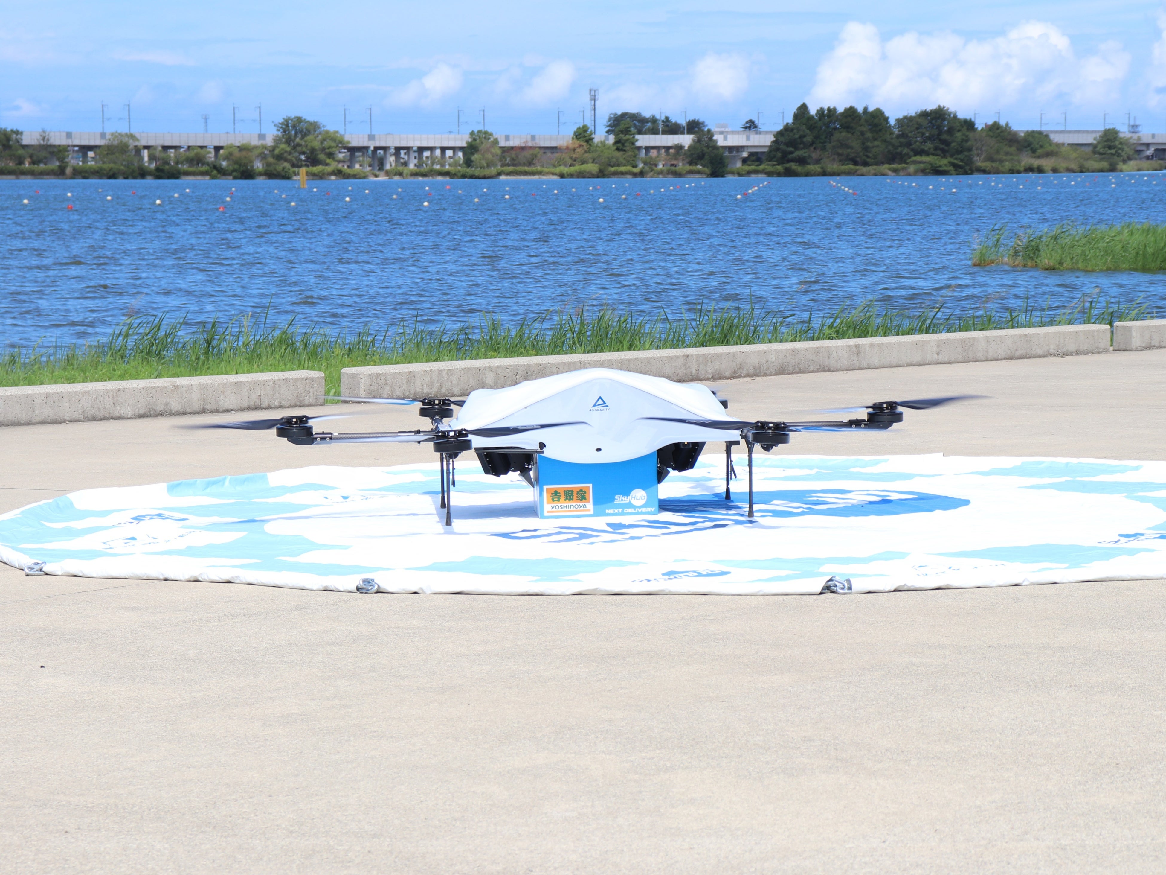ドローン配送にはエアロネクストが物流用途に特化してゼロから開発した可搬重量(ペイロード)最大5kg、最大飛行距離20kmの物流専用ドローンAirTruck*3を使用。