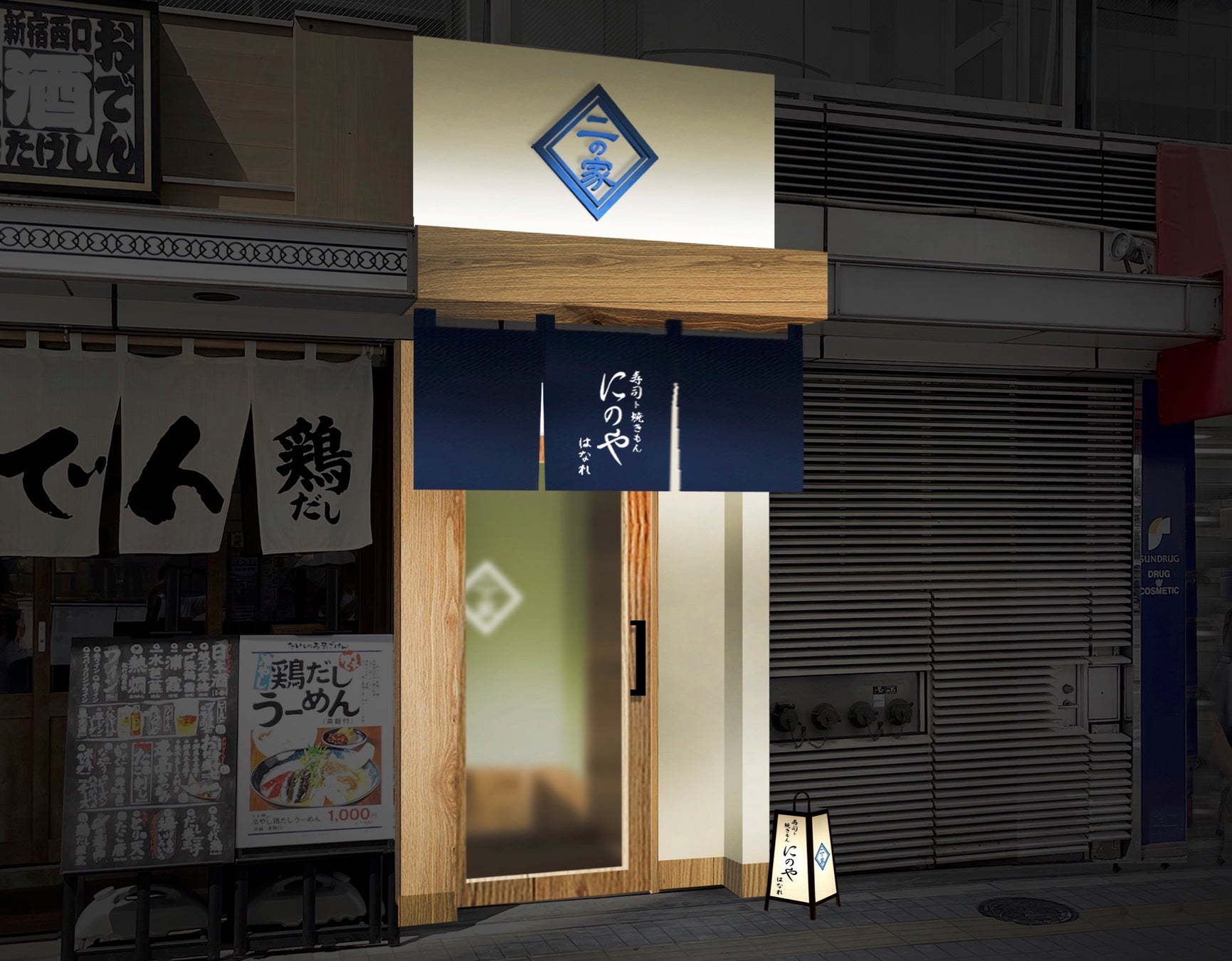 『寿司ト焼きもん にのや はなれ』は、2020年6月にオープンした「おでんトさかな にのや 西新宿店」の姉妹店にあたります。「おでんトさかな にのや 西新宿店」はオープン以来大変ご好評をいただき、連日多くのお客様にご来店いただいておりますが、満席でご案内できないことが多くあります。そこで今後、より多くのお客様ににのやをお楽しみいただくために、「おでんトさかな にのや 西新宿店」から徒歩1分、同じ通り(旧青梅街道)の地下1階に『寿司ト焼きもん にのや はなれ』をオープンする運びとなりました。地下1階という場所柄を活かした隠れ家感もありながら、大江戸線 新宿西口駅 D2出口直結という利便性も兼ねた店舗となります。