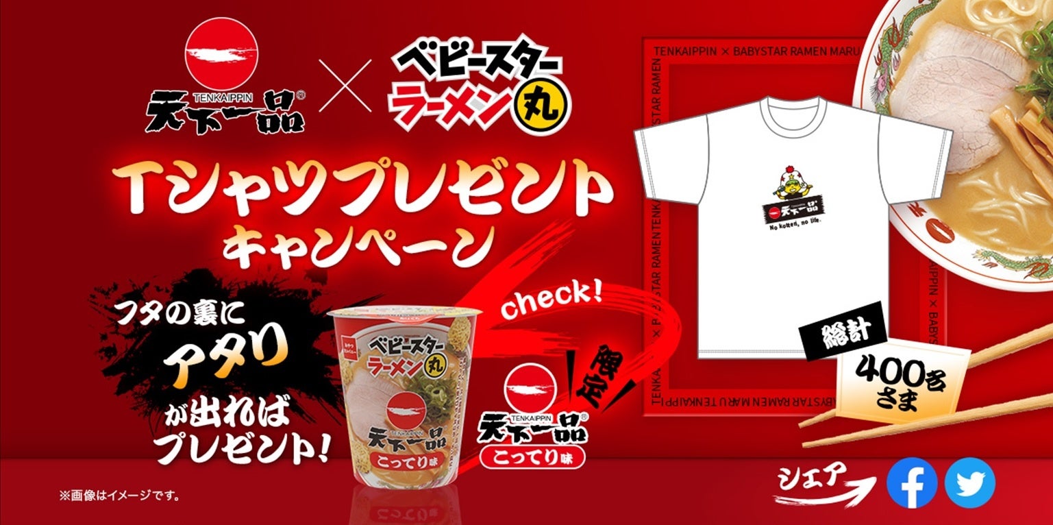 フタをめくって”アタリ”が出たら天下一品×ベビースターオリジナルTシャツがもらえる!プレゼントキャンペーン実施中