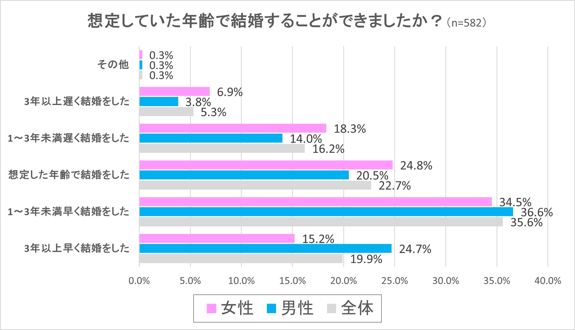 最も多かった回答は、「1~3年未満早く結婚をした」で、全体で35.6%、男性が36.6%、女性が34.5%という結果となりました。そして2番目に多かった回答が「想定した年齢で結婚をした」で、全体で22.7%、男性20.5%、女性24.8%という割合となりました。