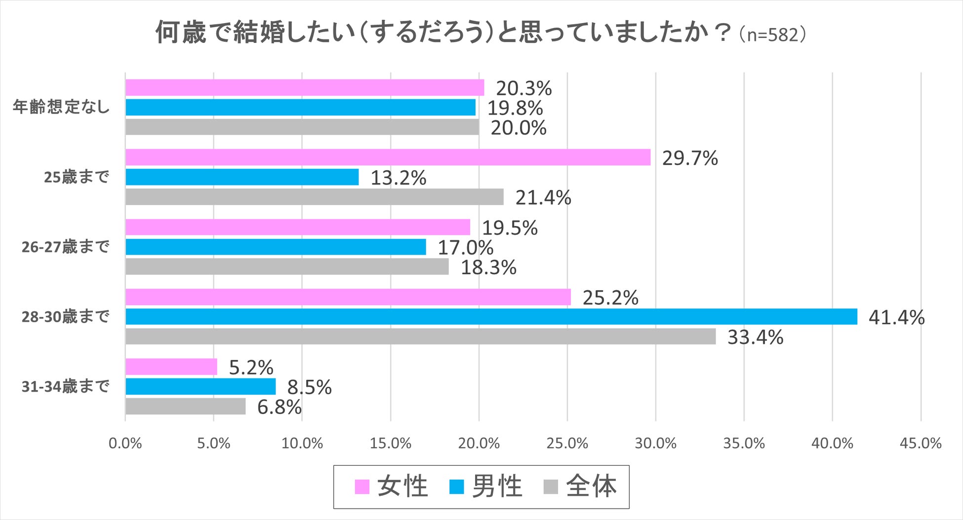 続いて男女別の結果をみてみると、女性は「25歳まで」が29.7%と圧倒的に割合が高く、一方、男性は「28-30歳まで」が41.4%で最も割合が高いという結果となりました。「26~27歳まで」は全体で18.3%、男性17.0%、女性19.5%で、「31-34歳」は、全体で6.8%、男性8.5%、女性5.2%という結果となりました。