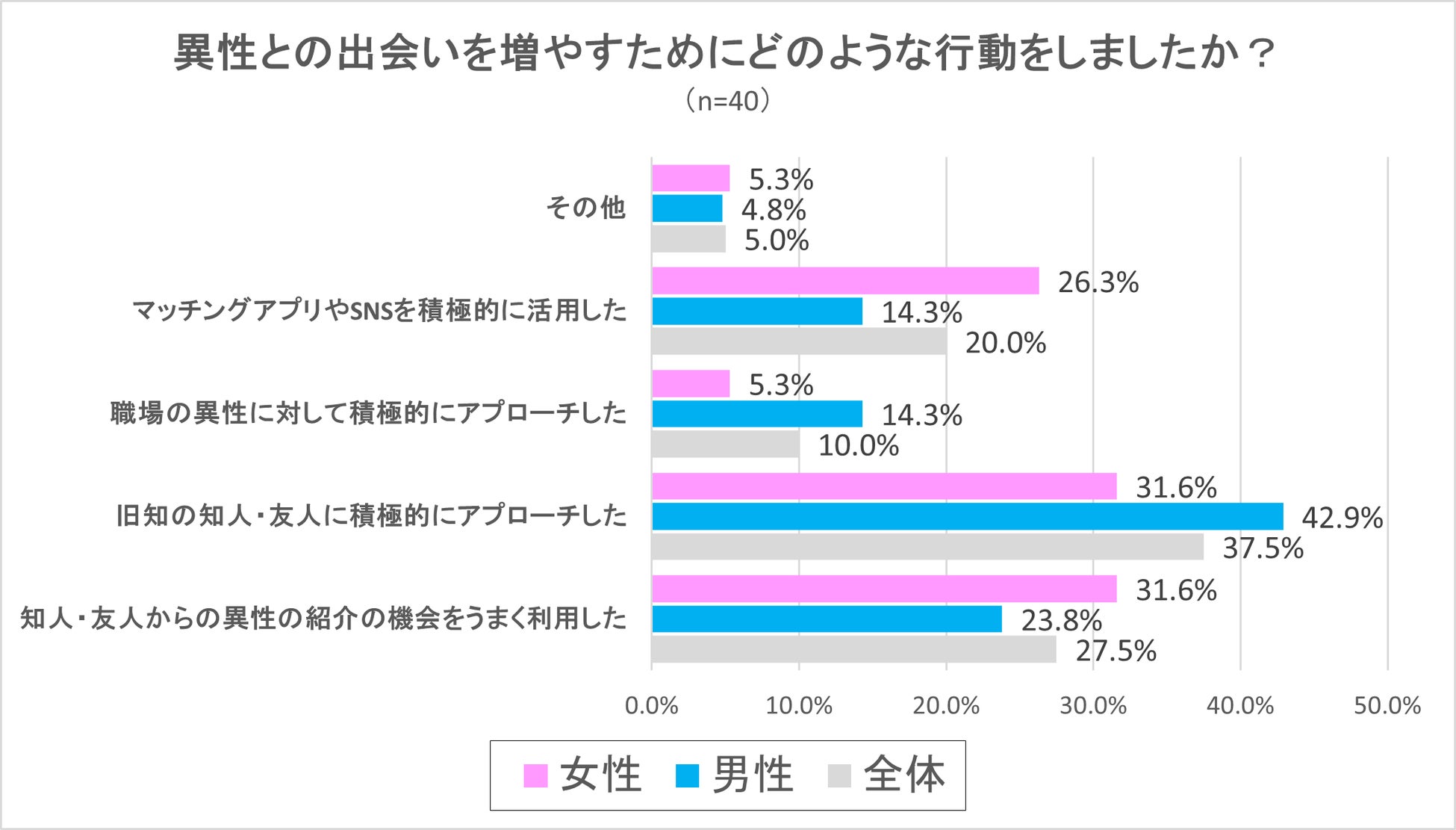 最も多かった回答は「旧知の知人・友人に積極的にアプローチをした」が、全体で37.5%、男性42.9%、女性31.6%という結果で、2番目に多かった回答は「知人・友人からの異性の紹介の機会をうまく利用した」が、全体で27.5%、男性23.8%、女性31.6%となりました。3番目は「マッチングアプリやSNSを積極的に活用した」という回答で、全体で20.0%、男性14.3%、女性26.3%という結果となり、続いて「職場の異性に積極的にアプローチした」が、全体で10.0%、男性14.3%、女性5.3%と続く結果となりました。