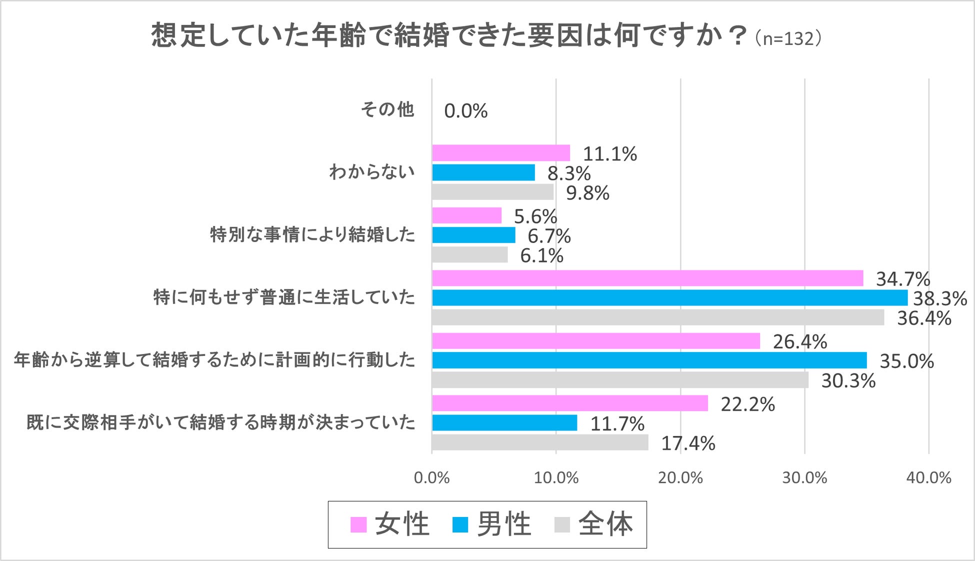 最も多かった回答は意外にも「特に何もせず普通に生活していた」という回答で、全体で36.4%、男性38.3%、女性34.7%という結果となり、男女ともに3割を超える回答割合となりました。2番目に多かった回答は、「年齢から逆算して結婚するために計画的に行動した」で、全体で30.3%、男性35.0%、女性26.4%という結果となり、男性では約3人に一人、女性では4人に一人が、結婚する年齢を想定して計画的に行動したということがわかる結果となりました。続いて3番目に多かった回答は「既に交際相手がいて結婚する時期が決まっていた」という回答で、全体で17.4%、男性11.7%、女性22.2%という結果となりました。そして特に要因は「わからない」という回答が全体で9.8%、「特別な事情により結婚した」が全体で6.1%という結果となりました。