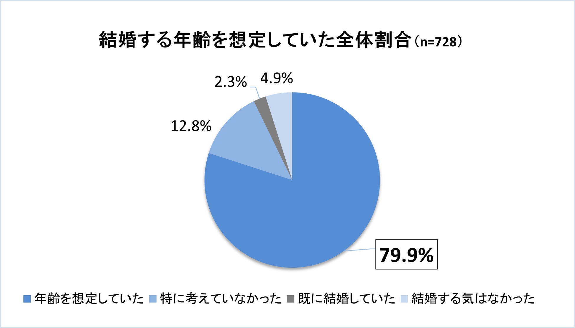 今回のアンケート対象者728人のうち約8割にあたる582人は、20歳の時点でご自身の結婚したい(するだろう)という年齢を想定していたことがうかがえる結果といえます。
