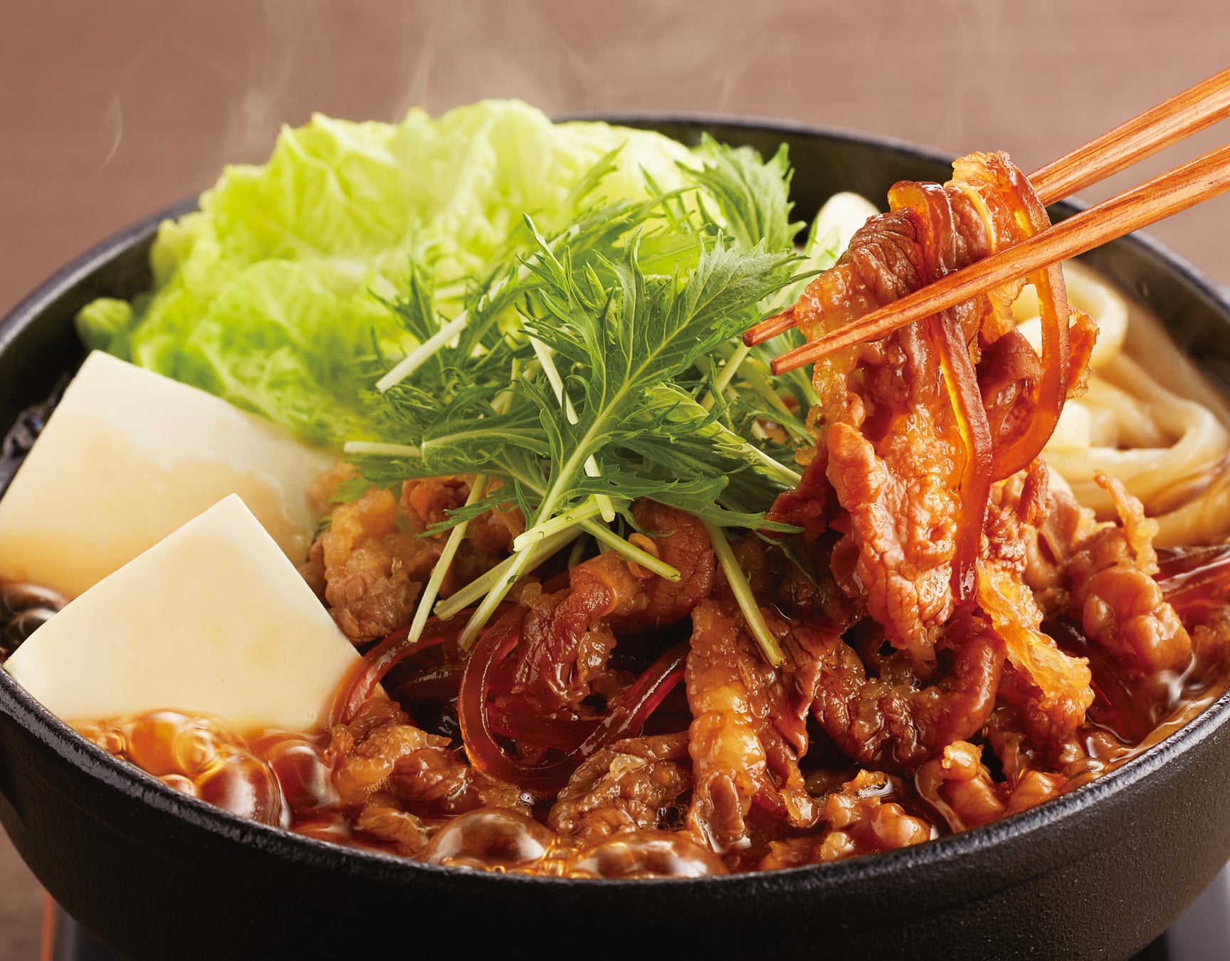 牛肉、野菜、豆腐、うどんは、甘辛の特製割下がしみ込み味わい深く、大満足の一品です。
