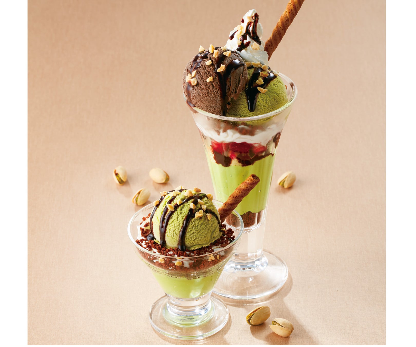 香ばしいピスタチオアイスとチョコレートアイスに、ピスタチオプリンを加えて濃厚に仕上げました。
