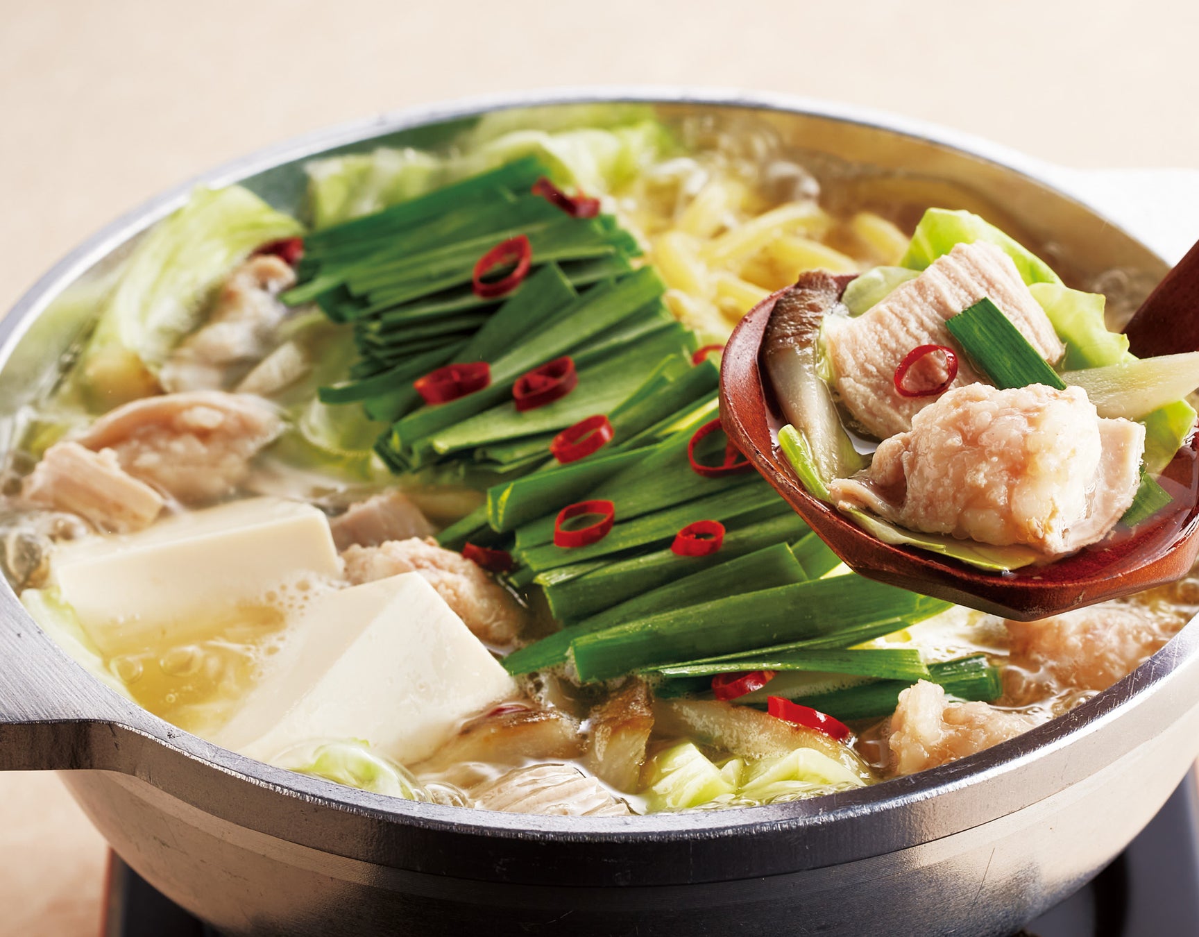 プリップリの牛もつと魚介出汁で旨味たっぷりの鍋。