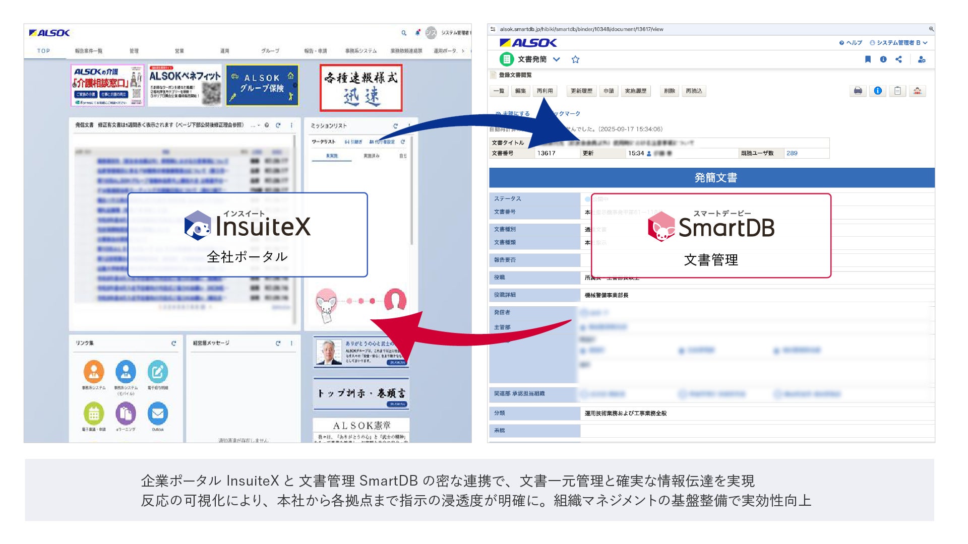 ALSOKでは、企業ポータルとして「InsuiteX(R)」、業務デジタル化基盤として「SmartDB(R)」を採用。 2024年7月に構築プロジェクトを始動し、試行期間を経て2025年4月より国内グループ会社71社を含む16,000以上のユーザーによる本格利用を開始しました。 現在では、DXを支える基盤としての成果が現れ始めています。