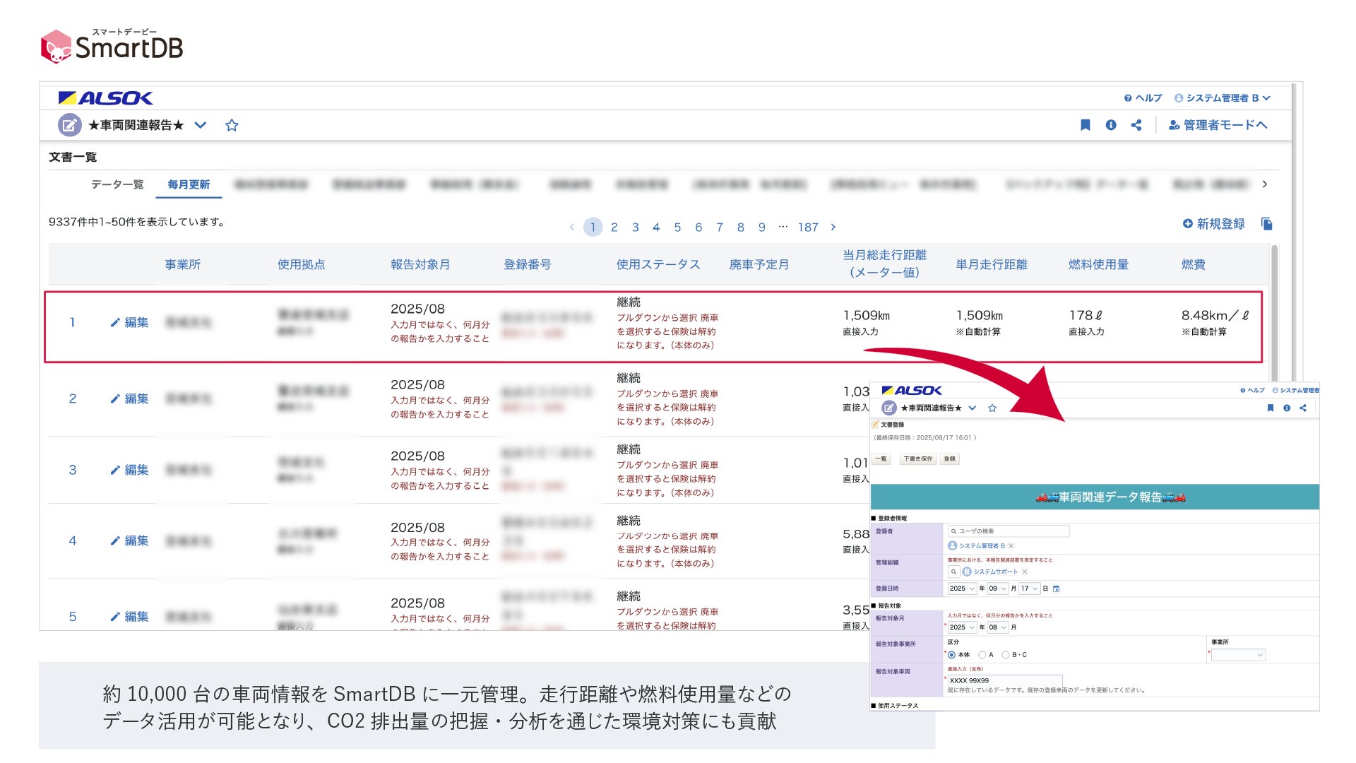 また、SmartDB(R)による業務のデジタル化も加速しています。 従来Excelで管理していた、業務用車両約10,000台の情報をSmartDB(R)に集約することで、走行距離や燃料使用量などのデータ活用が可能となり、CO2排出量の把握・分析を通じた環境対策にも貢献しています。