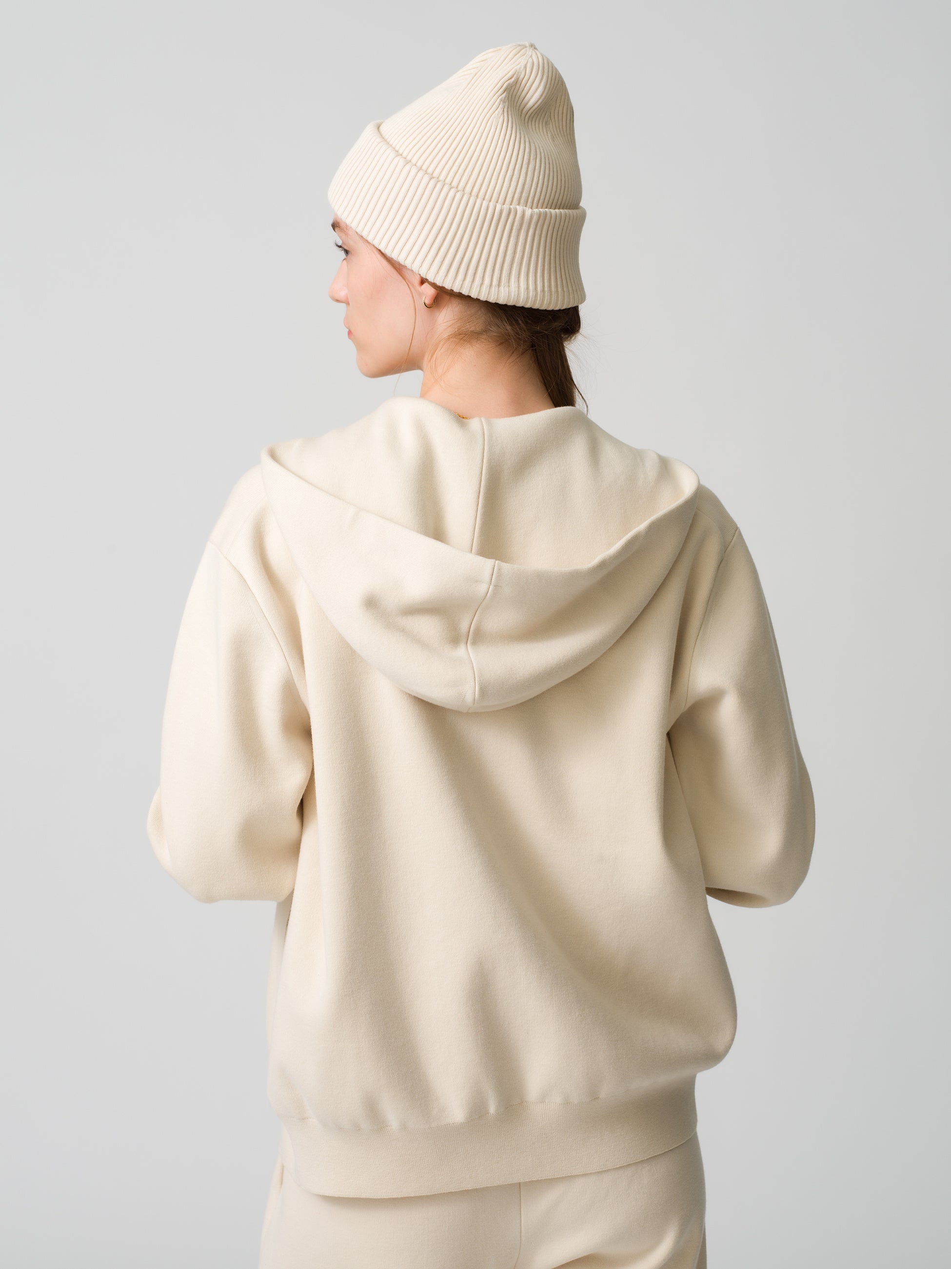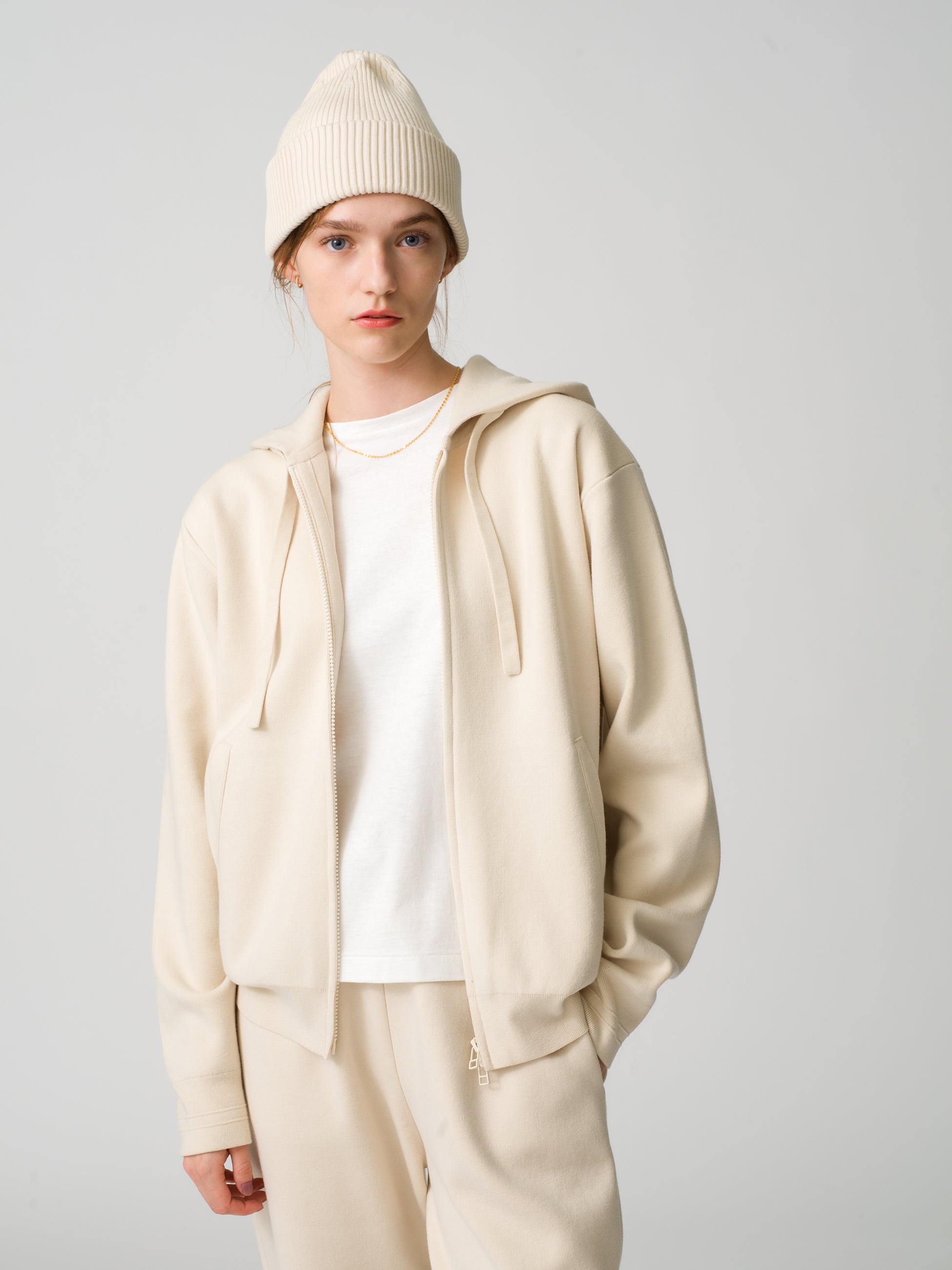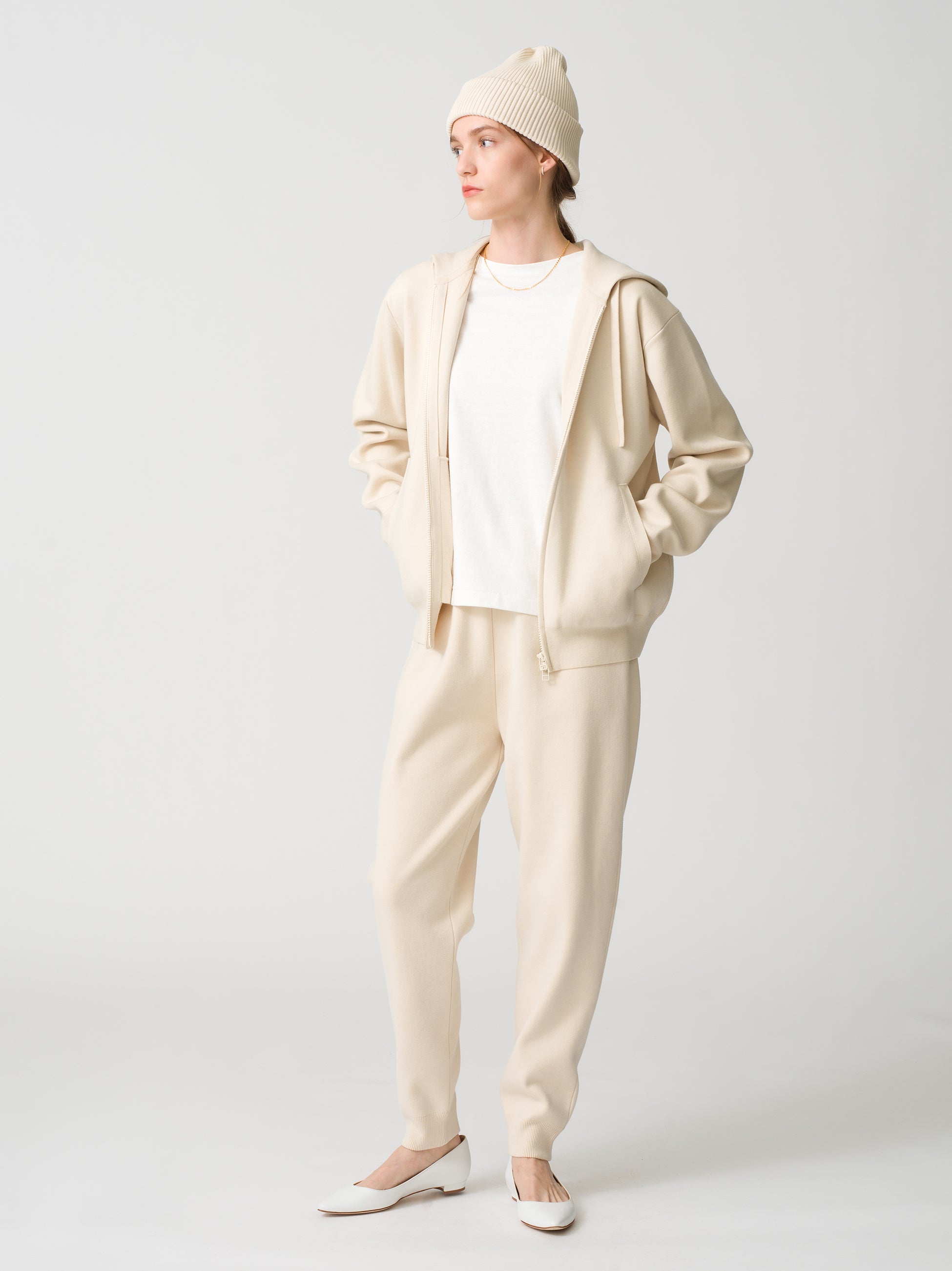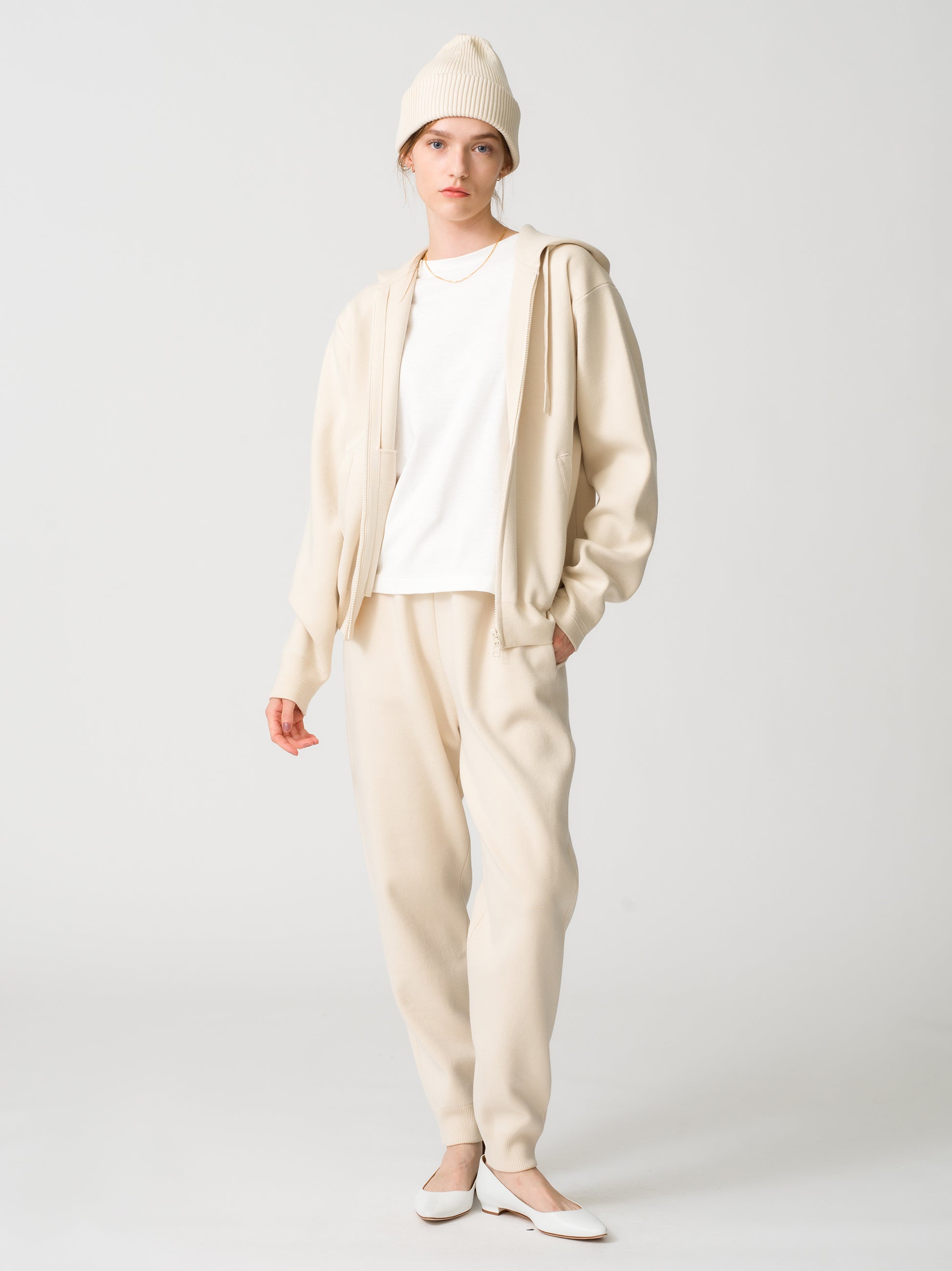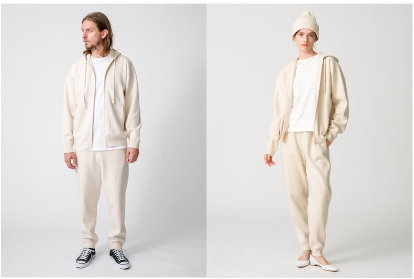 ▲ウィメンズ・メンズともに展開のシンプルかつ上質なジップアップフーディ、パンツ、ビーニー