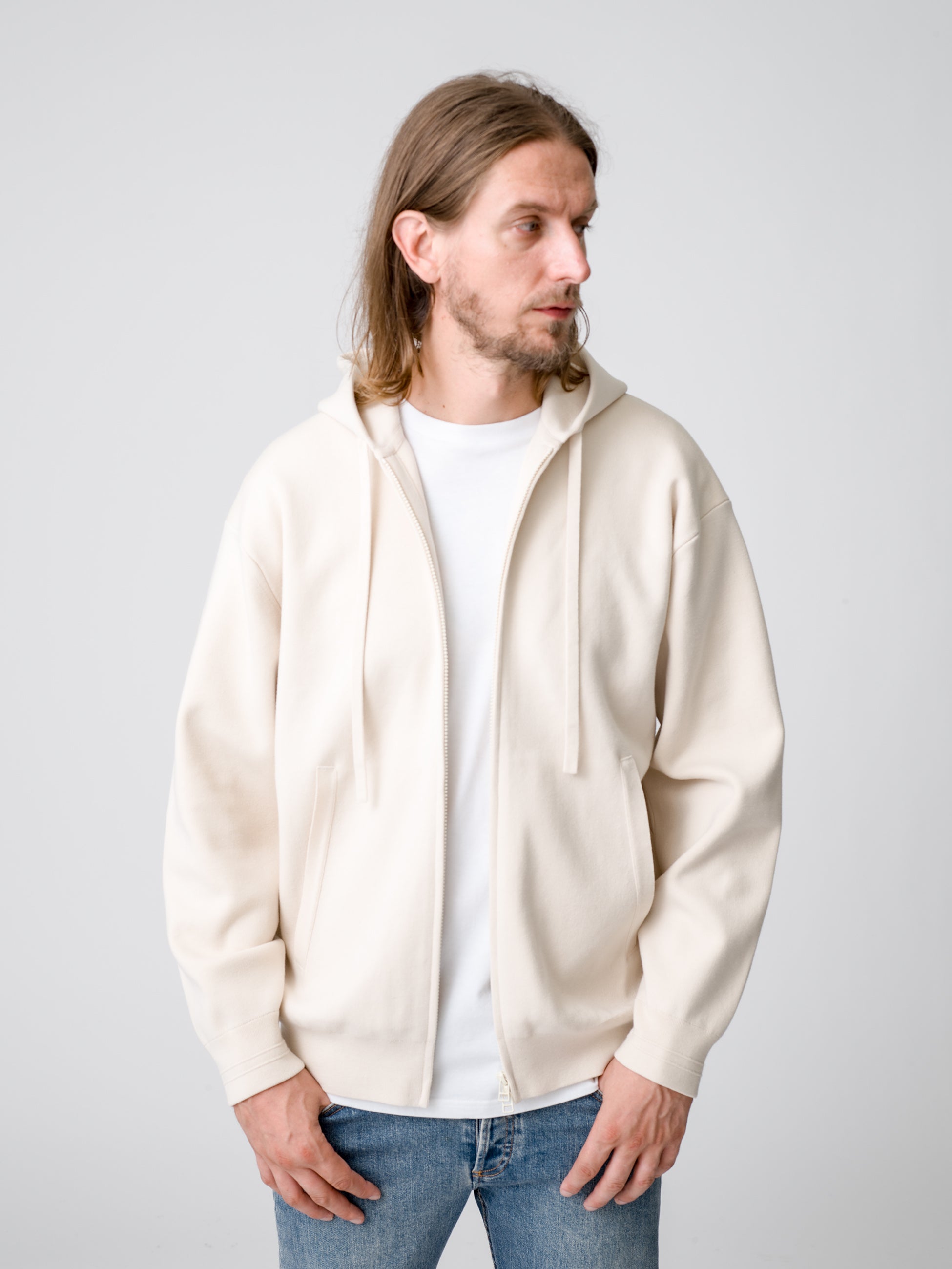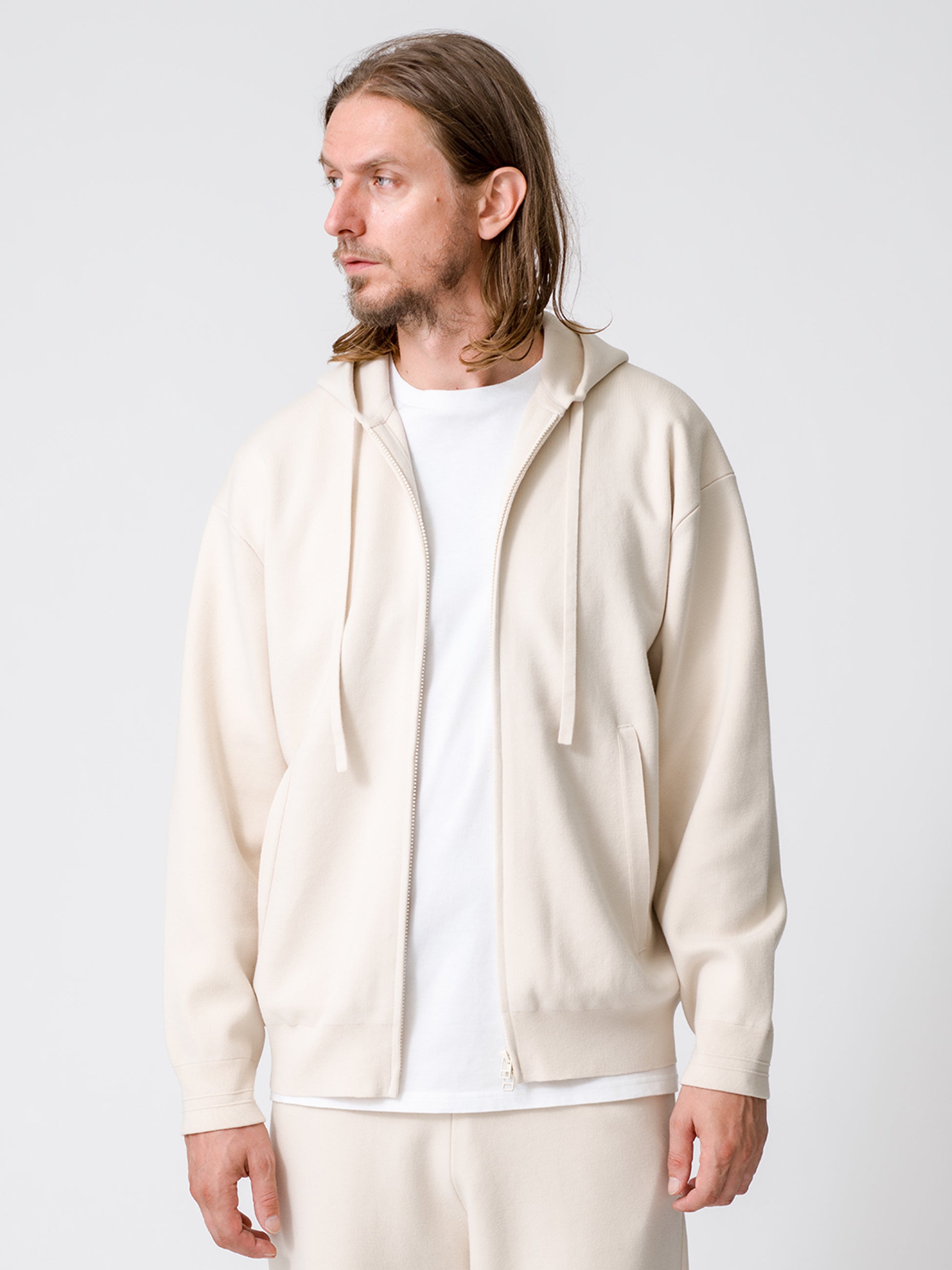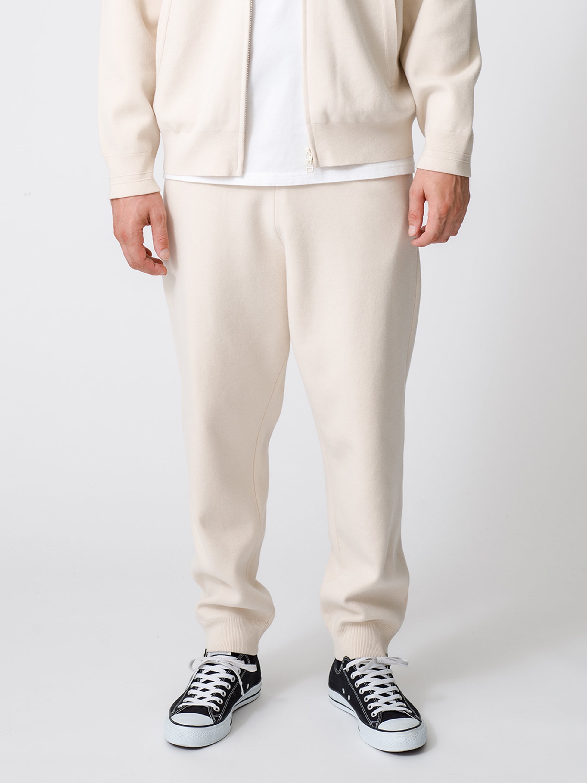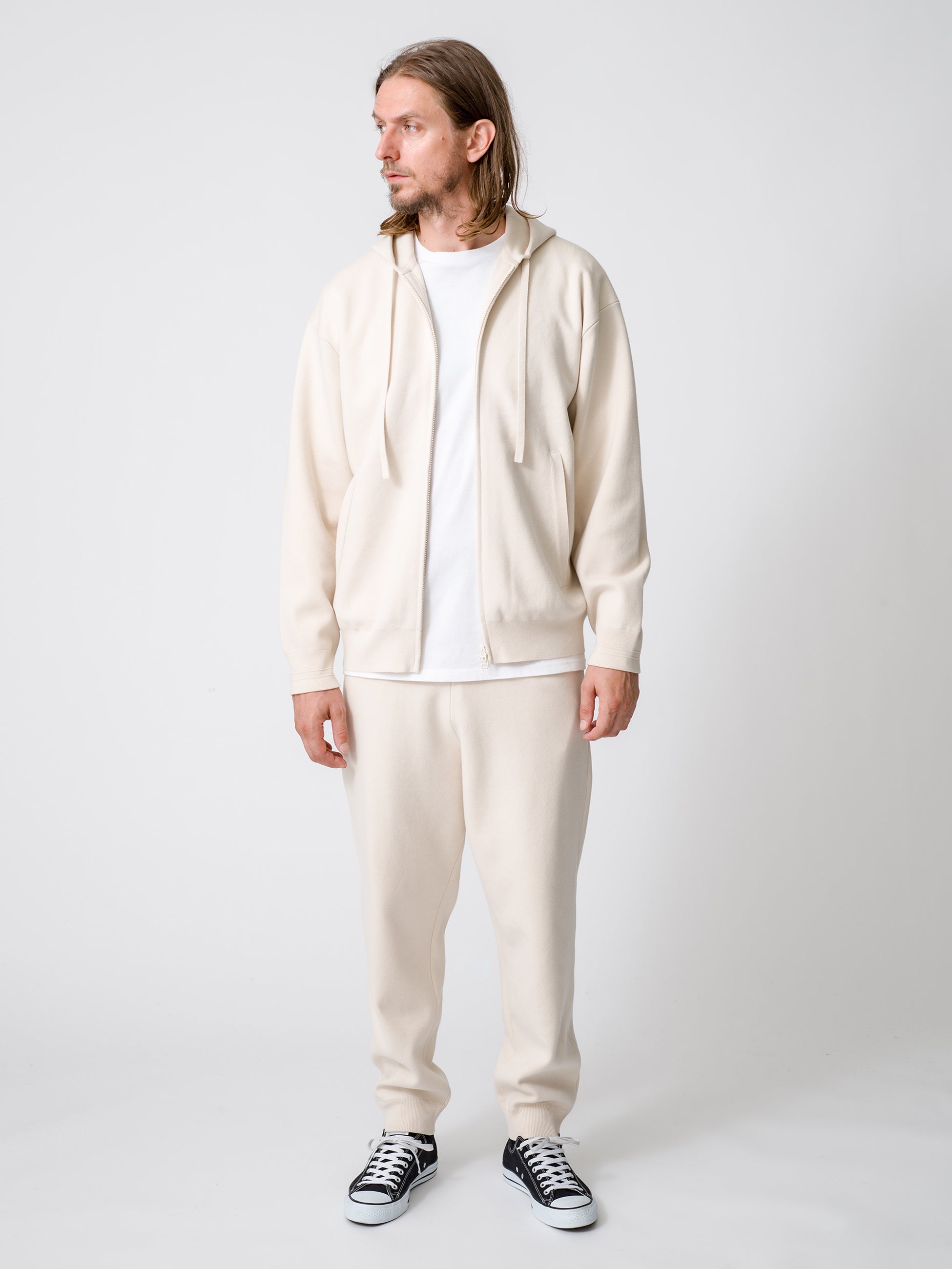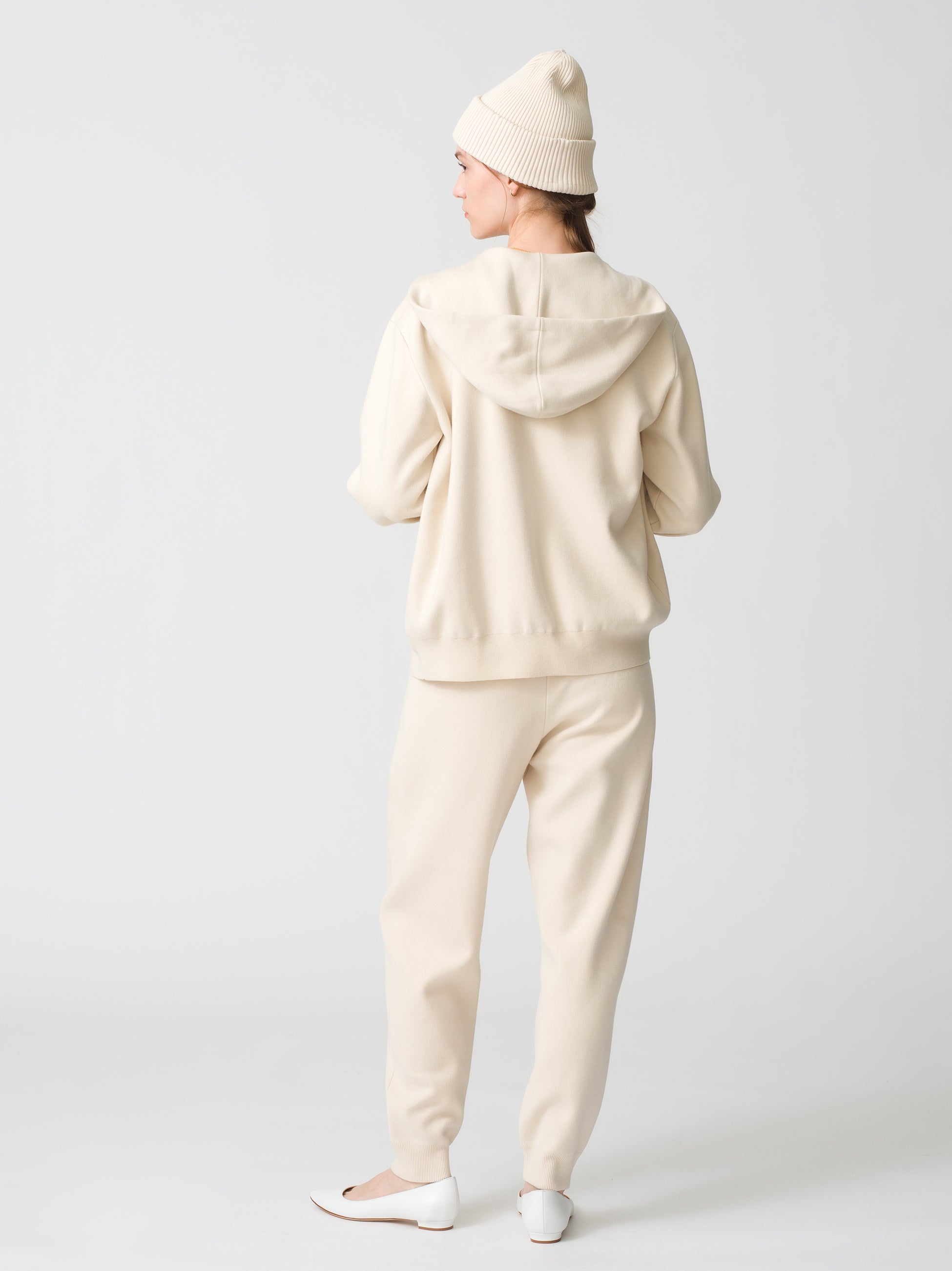 ▲ウィメンズ・メンズともに展開のシンプルかつ上質なジップアップフーディ、パンツ、ビーニー