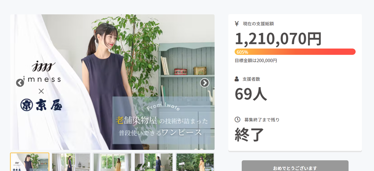 去年行ったクラウドファンディングでは日本国内の工場や技術を守っていきたいという想いをもとに岩手県一関市で100年続く「京屋染物店」と一緒に、生地の選定・染色をした特別なワンピースを製作しました。この想いは多くの方に共感いただき、達成率605%という結果となりました。