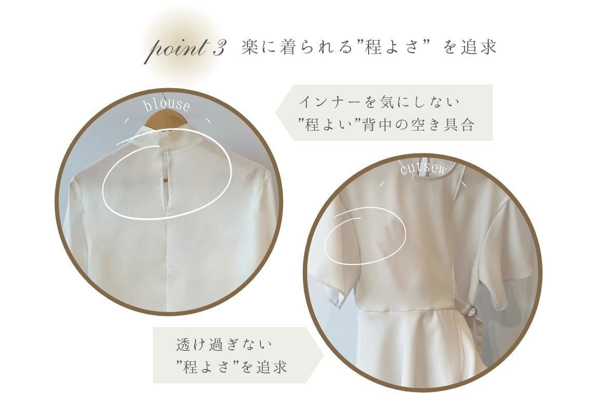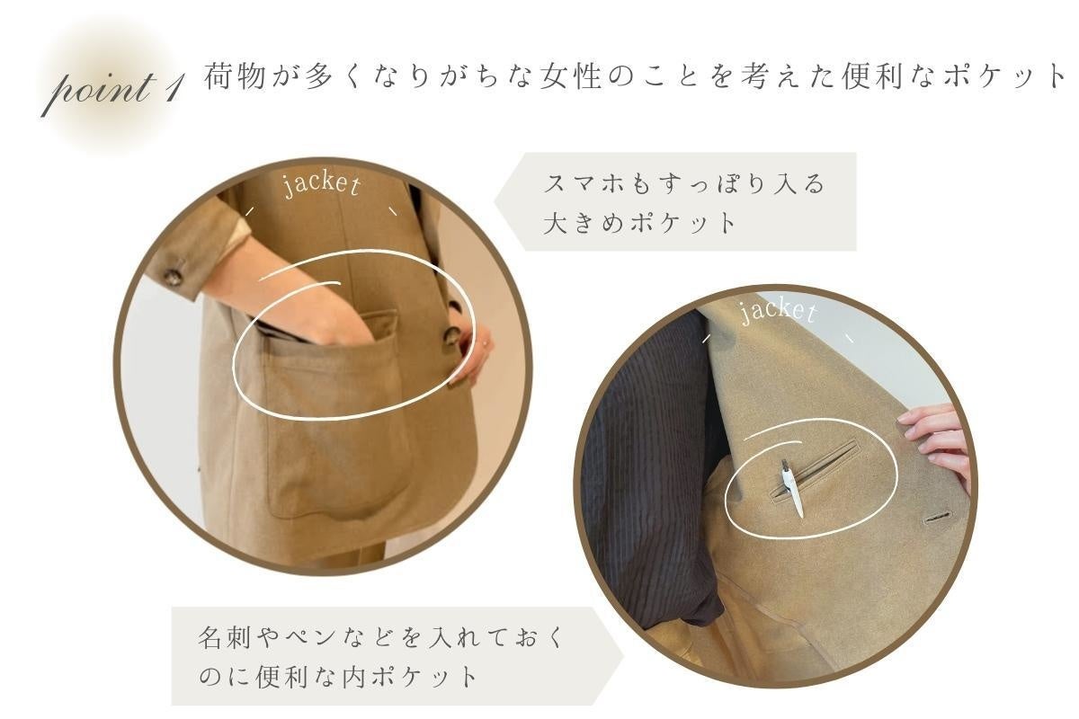 私たちの商品は、モノづくりのこだわりやトレーサビリティを大切にしている縫製工場の方々と製作した確かな品質があります。そして、これからの社会を牽引していく女性ビジネスパーソンが "働く自分を大切にできる" よう「自分自身の個性を大切にする」「快適に過ごせる」ためのこだわりを詰めた1着に仕立てました。