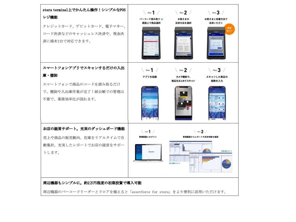 三井住友カード株式会社(代表取締役社長:大西 幸彦、以下「SMCC」)、SMBC GMO PAYMENT株式会社(代表取締役社長:田中 靖剛、以下「SGP」)、および三井住友ファイナンス&リース株式会社(代表取締役社長:橘 正喜、以下「SMFL」)は、小売業・調剤薬局を中心とした中小事業者のデジタルトランスフォーメーション(以下「DX」)支援やインボイス制度※1への対応強化を目的として、SMCCとSGPが提供している、オールインワン決済端末stera terminalを手軽にご利用いただくためのパッケージプラン「stera pack」に、SMFLが提供しているPOSレジアプリ「assetforce for stera(アセットフォース・フォー・ステラ)」を標準搭載したお得な新パッケージプラン「stera pack POS」を、サービス利用料 9,900円(税込)にて2022年12月1日より提供開始いたします。