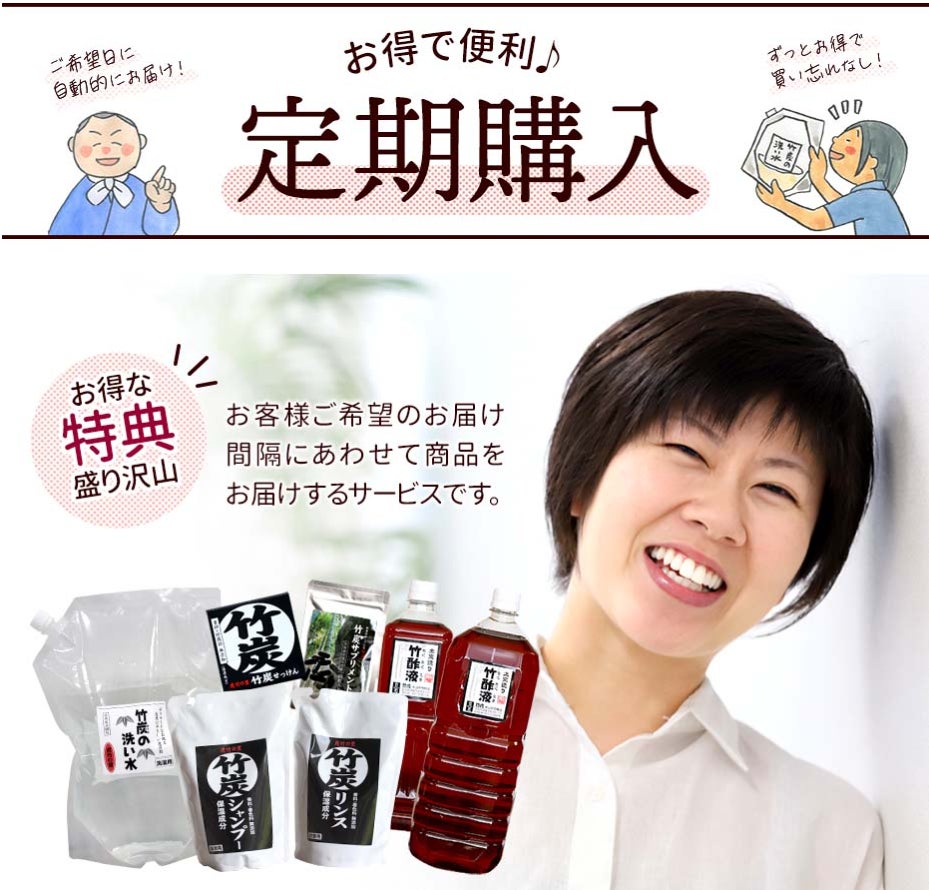 定期購入のメリットとして、竹虎本店の場合、送料が全国一律800円(北海道・沖縄1,500円)のところ、定期購入のご愛用者様のみ全国一律送料無料(北海道・沖縄750円)となります。メール便配送の商品(竹炭サプリメント)に限り北海道・沖縄も送料無料となる、お得なサービスとなります。