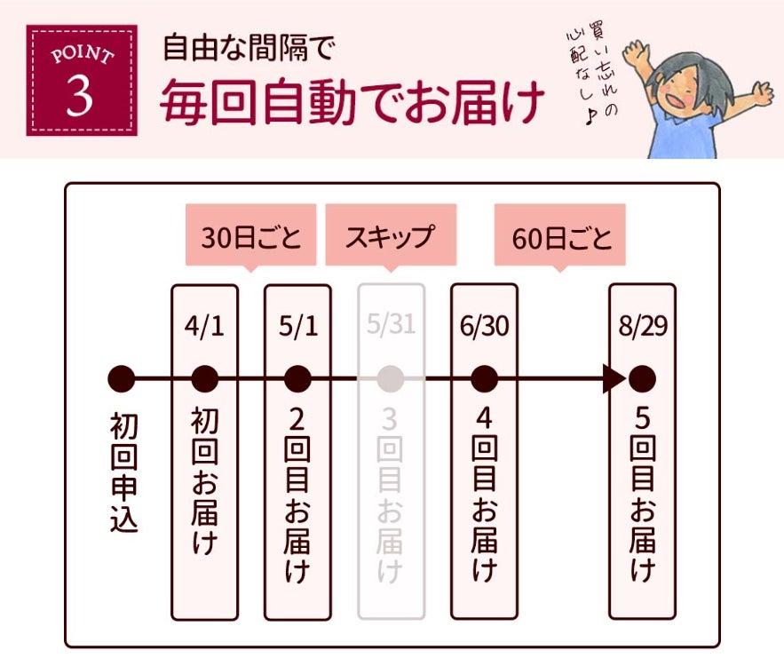 さらに、お届け頻度の設定にも柔軟に対応し、10日~90日の範囲でマイページから自由にお届け間隔を変更可能。その都度ご注文をする手間が無く、ご指定の日に自動的に商品をお届けし、ストックがまだ残っている場合などには、お届けをスキップしたり、お届け間隔を変更することもできます。