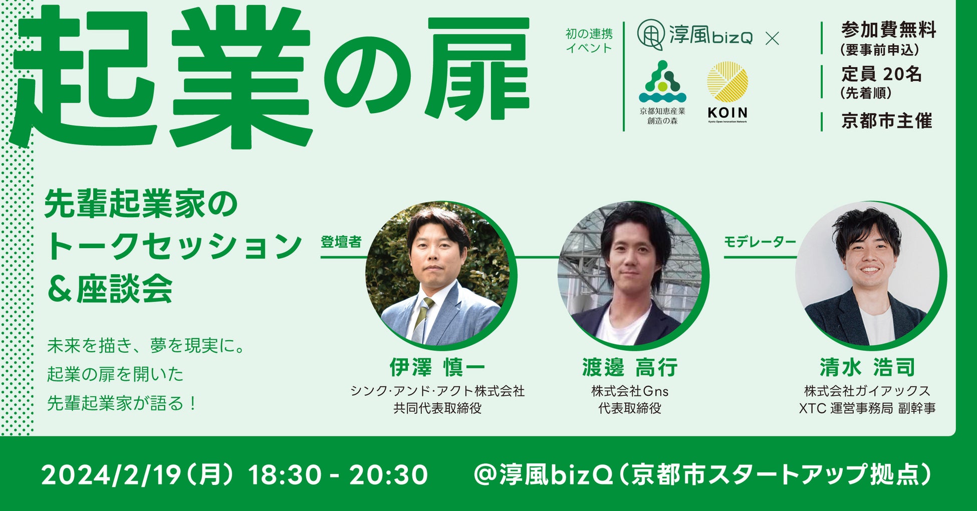 株式会社ツクリエ(本社:東京都千代田区 代表取締役:鈴木英樹 以下、ツクリエ)は、京都市創業・イノベーション拠点運営協議会から受託する京都市スタートアップ拠点「淳風bizQ」にて、先輩起業家のリアルな体験談が聞けるイベント「起業の扉 先輩起業家のトークセッション&座談会 ~未来を描き、夢を現実に。起業の扉を開いた先輩起業家が語る!~」を、2月19日(月)に開催します。