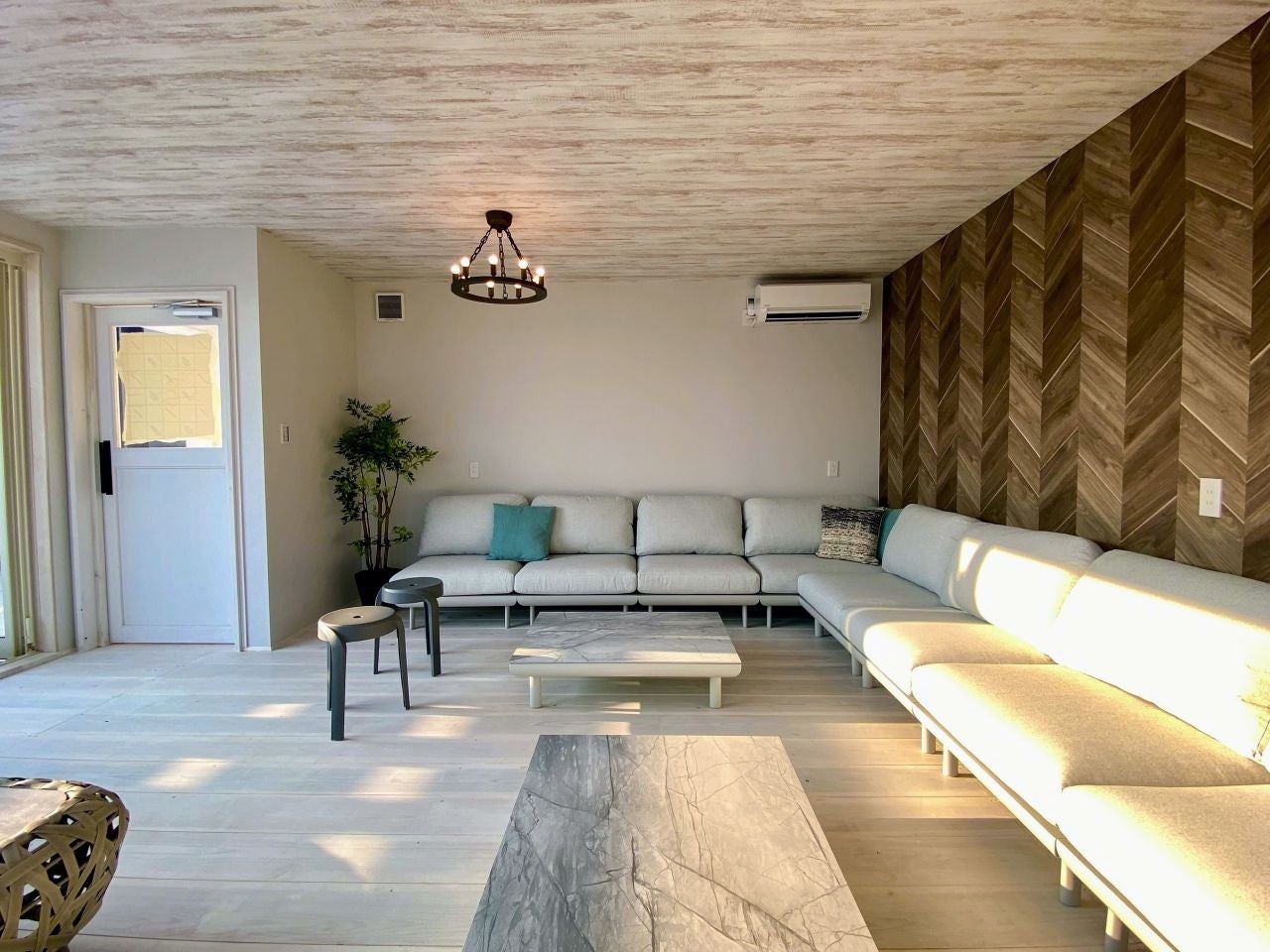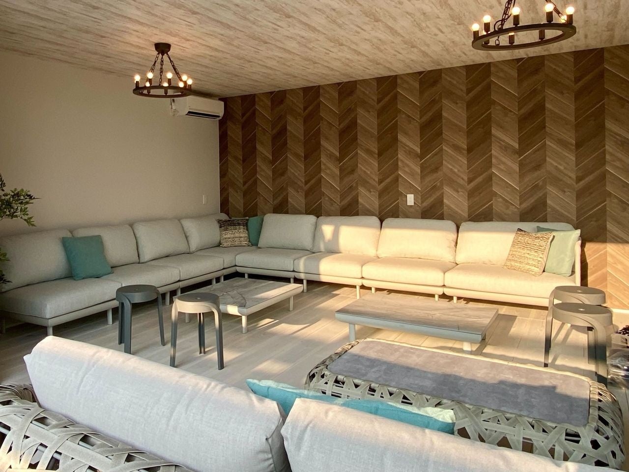クラスの法人向け「CLAS Biz」は、循環型の家具・家電・什器を活用し、プロのデザイナーが理想の空間づくりを提案します。「avex beach paradise」では、高級海外リゾートをテーマに、印象的な大型L字ソファを中心に据え、ゆったりと贅沢な空間演出をしました。