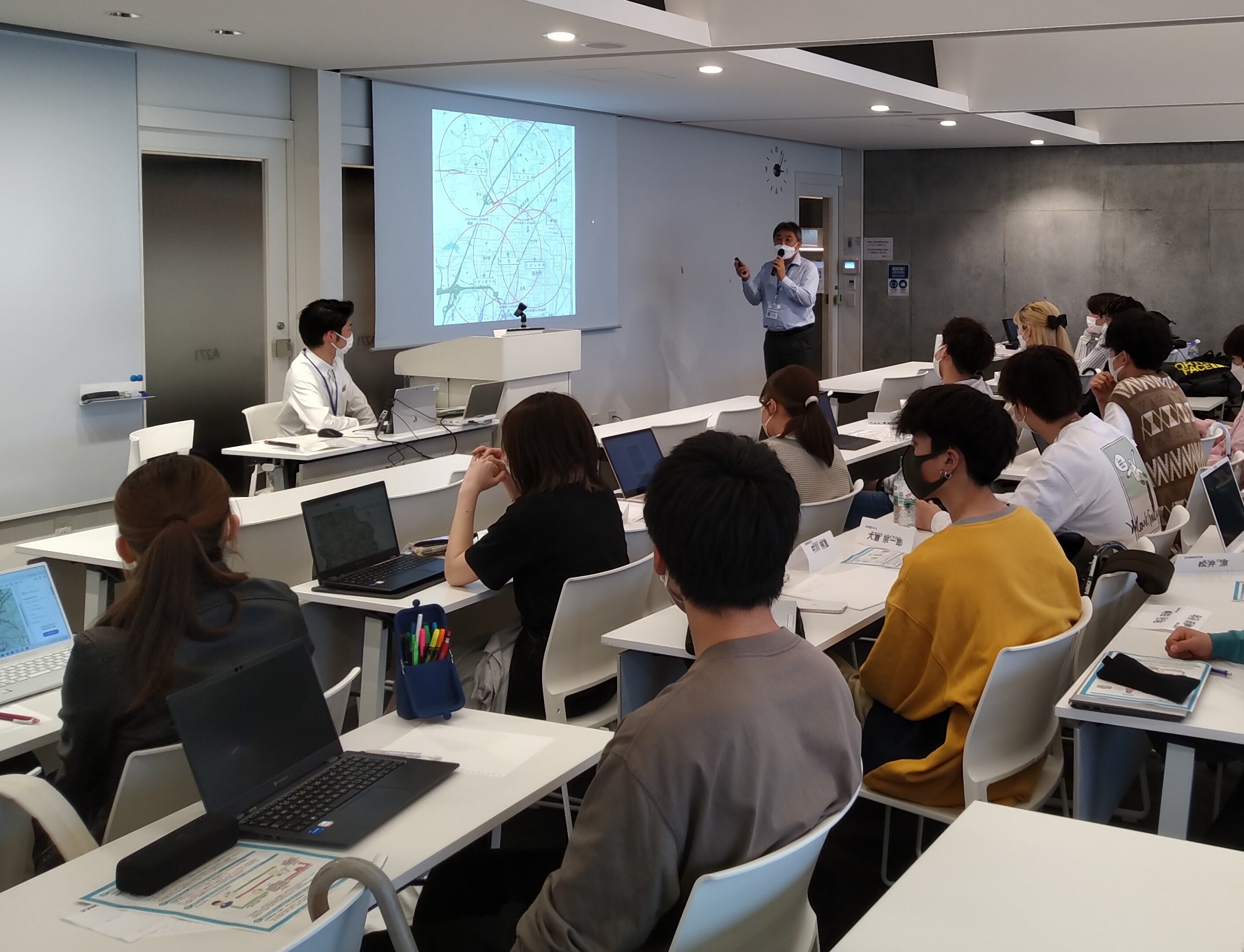 締結に先立って5月12日には、プロジェクト科目を履修する28名の学生が、茨木市選挙管理委員会の職員から、日本の選挙制度と投票率の現状について説明を受けました。加えて、これまでの取り組みとして「人がたくさん集まっているところに投票箱を」という考え方のもと、市内の4つの商業施設に期日前投票所を設置し、期日前投票数の約7割が商業施設で行われたといった事例の紹介もありました。