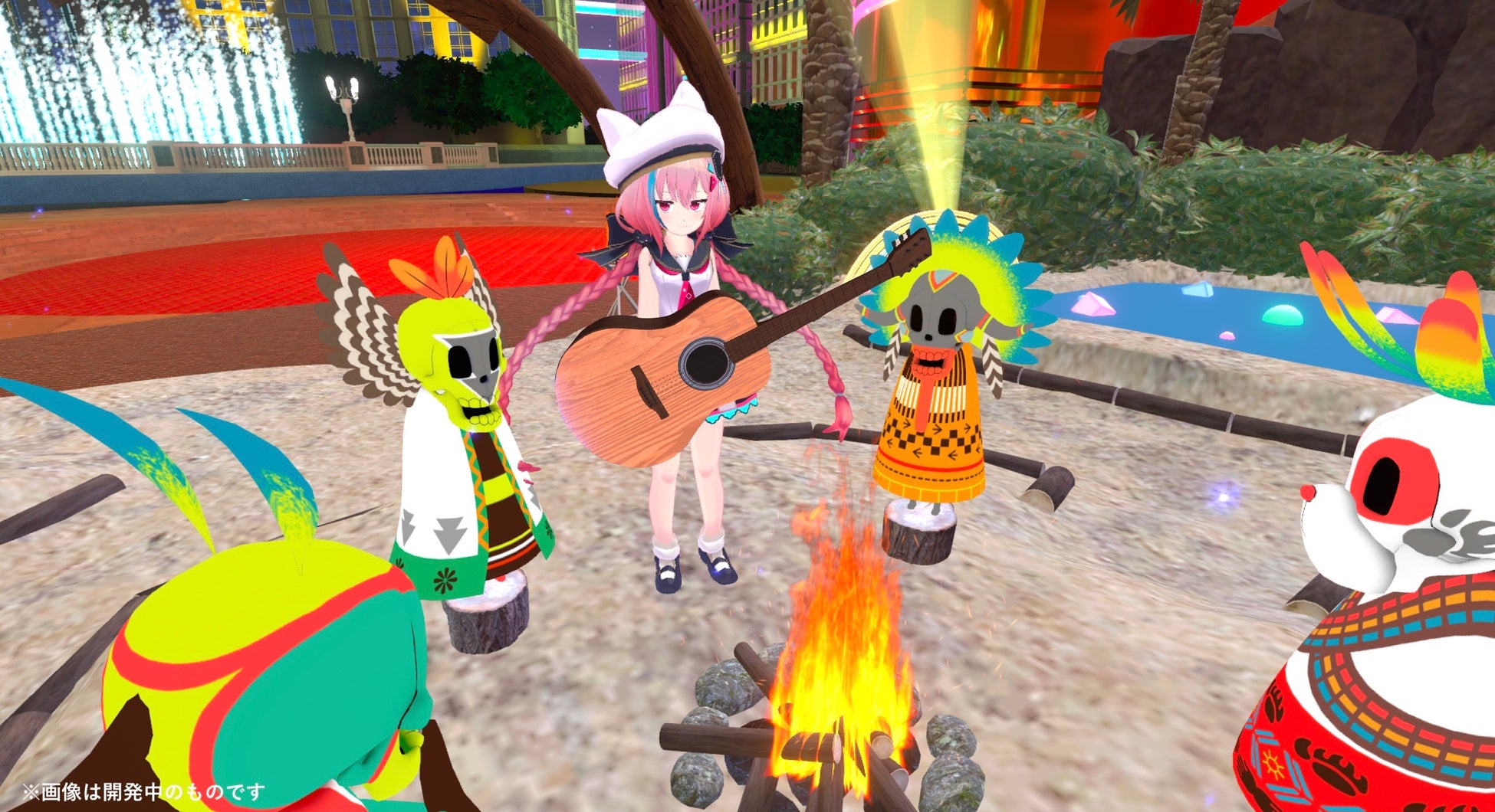 また、キャンプファイヤーの周りでは、自身でアバターを動かして楽器が演奏できるギミックも用意!メタバース上での新しい音楽の楽しみ方をご体験ください。