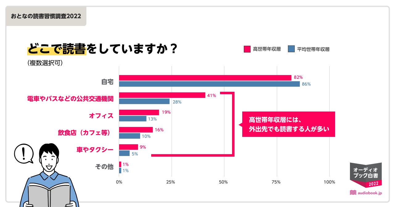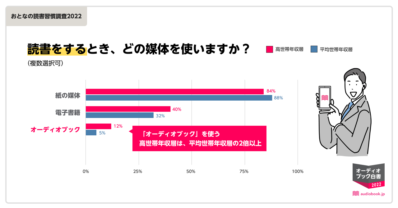 そこで、「オーディオブック」を含め、読書するときに使う媒体について高世帯年収層と平均世帯年収層に調査。結果は、どちらも「紙の書籍」「電子書籍」「オーディオブック」の順でしたが、大きな差があったのは「オーディオブック」で、高世帯年収層は、平均世帯年収層の2倍以上も「オーディオブック」を使う人が多いことがわかりました(高世帯年収層12%、平均世帯年収層5%)。