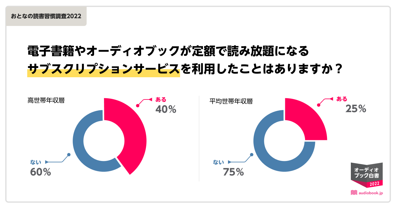 最近、電子書籍やオーディオブックが定額で読み放題になるサブスクリプションサービス(以下、読書サブスク)が増えています。高世帯年収層と平均世帯年収層に、読書サブスクを使っているか聞いたところ、使っていると回答した人が高世帯年収層は40%、平均世帯年収層は25%で、高世帯年収層の方が約1.6倍も多い結果になりました。読書習慣のある人が多い高世帯年収層は、電子書籍やオーディオブックなどの読書サブスクを取り入れて、読書に活用している人が多いようです。