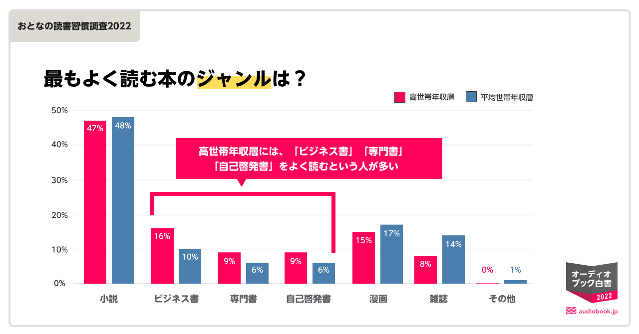 日本一のオーディオブック書籍ラインナップ数(※1)を配信する「audiobook.jp」を運営する株式会社オトバンク( 本社:東京都文京区、代表取締役社長:久保田裕也、以下「オトバンク」)は、10月27日から始まる読書週間(10月27日~11月9日)にあわせ、高年収のビジネスパーソンの「読書事情」を探るべく、世帯年収1,000万円以上の高世帯年収層と、日本の平均世帯年収である年収500~600万円未満の平均世帯年収層を対象に比較調査を実施した結果を発表します。