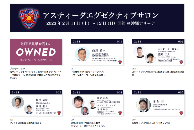 豪華ビジネスパーソンのアスティーダ エグゼクティブ サロン講演動画を無料配信新コンテンツ「琉球アスティーダオンデマンドページ」で、視聴登録を受付開始!