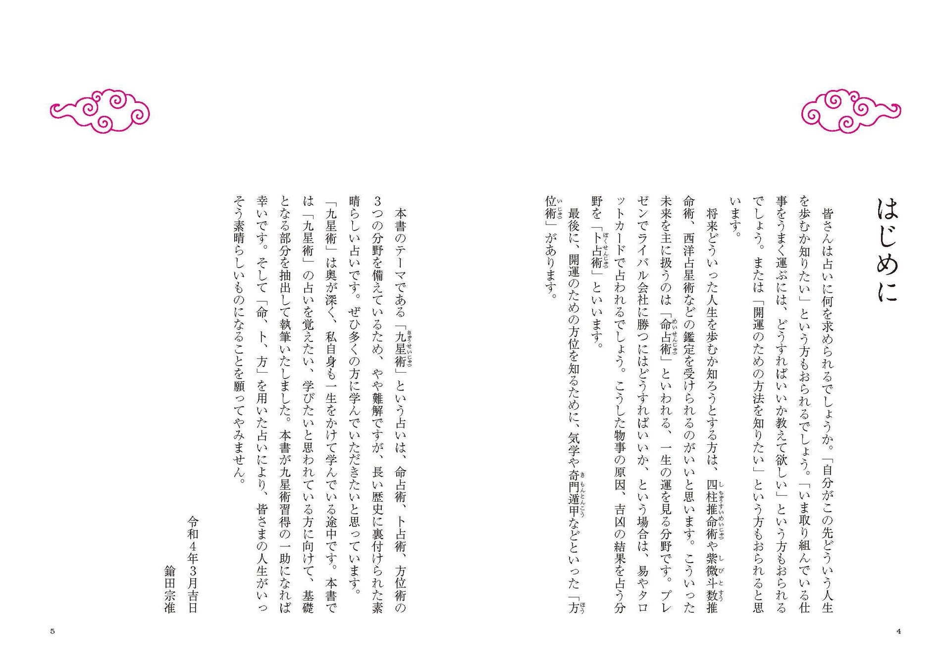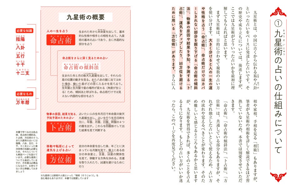 「自分がこの先どういう人生を歩むのか?」一生の運をみる分野、未来を扱うのは「命占術」、「いま取り組んでいる仕事をうまく運ぶためには、どうすればいいか?」という場合は、易やタロットカードなどの原因、吉凶を占う「卜占術」、「開運の方位を知りたい」という場合には「方位術」、この3つの分野を押さえている「九星術」だからこそ、やや難解だが、多くのことを占える優れた魅力がある。変化の波に乗るための必携の1冊!