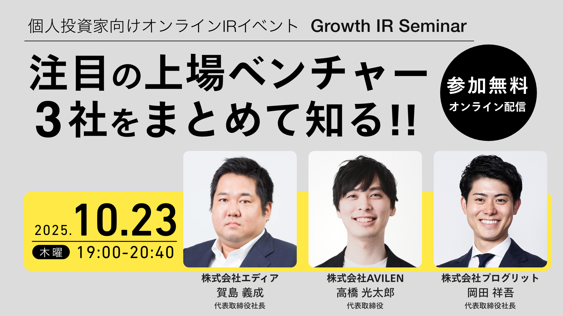 株式会社AVILEN(本社:東京都中央区、代表取締役:高橋 光太郎、以下「AVILEN」)は、2025年10月23日(木)に、グロース・キャピタル株式会社が主催する、個人投資家向けオンラインIRイベント「Growth IR Seminar」に登壇することをお知らせいたします。